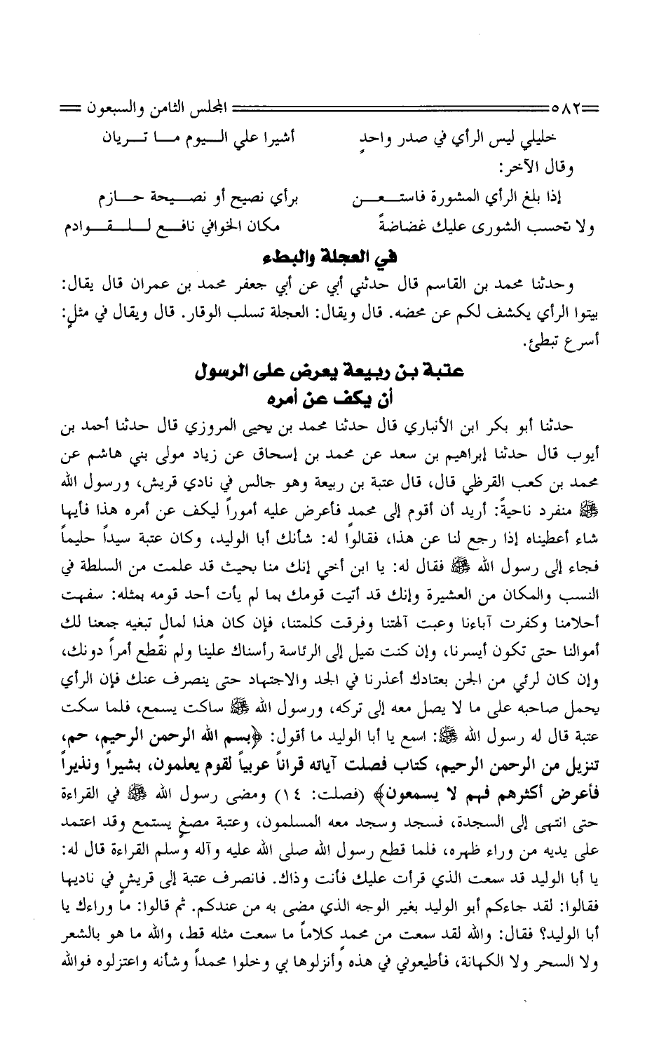 حَدَّثَنَا أَبُو بَكْرِ ابْن الأنبَاريّ قَالَ حَدَّثَنَا مُحَمَّد بْن يَحْيَى الْمَرْوَزِيُّ قَالَ حَدَّثَنَا أَحْمَدُ بْنُ أَيُّوبَ قَالَ حَدَّثَنَا إِبْرَاهِيمُ بْنُ سَعْدٍ عَنْ مُحَمَّدِ بْنِ إِسْحَاقَ عَنْ زِيَادٍ مَوْلَى بَنِي هَاشِمٍ عَنْ مُحَمَّدِ بْنِ كَعْبٍ الْقُرَظِيِّ قَالَ، قَالَ عُتْبَةُ بْنُ رَبِيعَةَ وَهُوَ جَالِسٌ فِي نَادِي قُرَيْشٍ، وَرَسُولُ اللَّهِ صَلَّى اللَّهُ عَلَيْهِ وَسَلَّمَ مُنْفَرِدٌ نَاحِيَةً: أُرِيدُ أَنْ أَقُومَ إِلَى محمدٍ فَأَعْرِضُ عَلَيْهِ أُمُورًا لِيَكُفَّ عَنْ أَمْرِهِ هَذَا فَأَيُّهَا شَاءَ أَعْطَيْنَاهُ إِذَا رَجَعَ لَنَا عَنْ هَذَا، فَقَالُوا لَهُ: شَأْنك أَبَا الْوَلِيدِ، وَكَانَ عُتْبَةُ سَيِّدًا حَلِيمًا فَجَاءَ إِلَى رَسُولِ اللَّهِ صَلَّى اللَّهُ عَلَيْهِ وَسَلَّمَ فَقَالَ لَهُ: يَا ابْن أَخِي إِنَّكَ مِنَّا بِحَيْثُ قَدْ علمت من السطة فِي النَّسَبِ وَالْمَكَانِ مِنَ الْعَشِيرَةِ وَإِنَّكَ قَدْ آتَيْتَ قَوْمَكَ بِمَا لَمْ يَأْتِ أَحَدٌ قَوْمَهُ بِمِثْلِهِ: سَفَّهْتَ أَحْلامَنَا وَكَفَّرْتَ آبَاءَنَا وَعِبْتَ آلِهَتَنَا وَفَرَّقْتَ كَلِمَتَنَا، فَإِنْ كَانَ هَذَا لمالٍ بتغيه جَمَعْنَا لَكَ أَمْوَالَنَا حَتَّى تَكُونَ أَيْسَرَنَا، وَإِنْ كُنْتَ تَمِيلُ إِلَى الرِّئَاسَةِ رَأَّسْنَاكَ عَلَيْنَا وَلَمْ نَقْطَعْ أَمْرًا دُونَكَ، وَإِنْ كَانَ لِرَئِيٍّ من الْجِنّ بعتادك أَعْذَرْنَا فِي الْجِدِّ وَالاجْتِهَادِ حَتَّى ينْصَرف عَنْك فَإِن الرَّأْي يَحْمِلُ صَاحِبَهُ عَلَى مَا لَا يَصِلُ مَعَهُ إِلَى تَرْكِهِ، وَرَسُولُ اللَّهِ صَلَّى اللَّهُ عَلَيْهِ وَسَلَّمَ سَاكِتٌ يَسْمَعُ، فَلَمَّا سَكَتَ عُتْبَةُ قَالَ لَهُ رَسُولُ اللَّهِ صَلَّى اللَّهُ عَلَيْهِ وَسَلَّمَ: اسْمَعْ يَا أَبَا الْوَلِيدِ مَا أَقُولُ: " بِسْمِ اللهِ الرَّحْمنِ الرَّحِيمِ، حم، تَنْزِيلٌ مِنَ الرَّحْمَنِ الرَّحِيمِ، كِتَابٌ فُصِّلَتْ آيَاته قراناً عَرَبِيًّا لِقَوْمٍ يَعْلَمُونَ، بَشِيرًا وَنَذِيرًا فَأَعْرَضَ أَكْثَرُهُمْ فَهُمْ لَا يَسْمَعُونَ " فصلت:14 وَمَضَى رَسُولُ اللَّهِ صَلَّى الله عَلَيْهِ وَسلم آله فِي الْقِرَاءَةِ حَتَّى انْتَهَى إِلَى السَّجْدَةِ، فَسَجَدَ وَسَجَدَ مَعَهُ الْمُسْلِمُونَ، وَعُتْبَةُ مصغٍ يَسْتَمِعُ وَقَدِ اعْتَمَدَ عَلَى يَدَيْهِ مِنْ وَرَاءِ ظَهْرِهِ، فَلَمَّا قَطَعَ رَسُولُ اللَّهِ صَلَّى الله عَلَيْهِ وَآله وَسَلَّمَ الْقِرَاءَةَ قَالَ لَهُ: يَا أَبَا الْوَلِيدِ قَدْ سَمِعْتَ الَّذِي قَرَأْتُ عَلَيْكَ فَأَنْتَ وَذَاكَ. فَانْصَرَفَ عُتْبَةُ إِلَى قريشٍ فِي نَادِيهَا فَقَالُوا: لَقَدْ جَاءَكُمْ أَبُو الْوَلِيدِ بِغَيْر الْوَجْه الَّذِي مضى بِهِ مِنْ عِنْدِكُمْ. ثُمَّ قَالُوا: مَا وَرَاءَكَ يَا أَبَا الْوَلِيدِ؟ فَقَالَ: وَاللَّهِ لَقَدْ سَمِعْتُ مِنْ محمدٍ كَلامًا مَا سَمِعْتُ مِثْلَهُ قَطُّ، وَاللَّهِ مَا هُوَ بِالشِّعْرِ وَلا السِّحْرِ وَلا الْكَهَانَةِ، فَأَطِيعُونِي فِي هَذِهِ وَأَنْزِلُوهَا بِي وَخَلُّوا مُحَمَدًّا وشأنه واعتزلوه فو الله
