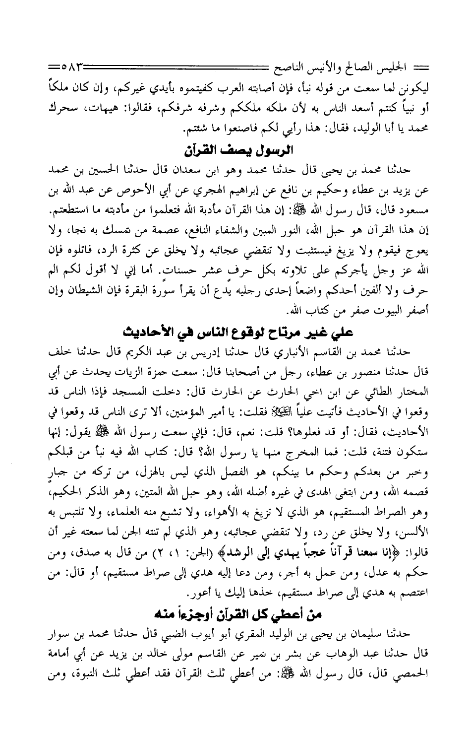 حَدَّثَنَا مُحَمَّدُ بْنُ يَحْيَى قَالَ حَدَّثَنَا مُحَمَّدُ وَهُوَ ابْنُ سَعْدَانَ قَالَ حَدَّثَنَا الْحُسَيْن بْنِ مُحَمَّدٍ عَنْ يَزِيدَ بْنِ عَطَاءٍ وَحَكِيمُ بْنُ نَافِعٍ عَنْ إِبْرَاهِيمَ الْهَجَرِيِّ عَنْ أَبِي الأَحْوَصِ عَنْ عَبْدِ اللَّهِ بْنِ مَسْعُودٍ قَالَ، قَالَ رَسُولُ اللَّهِ صَلَّى اللَّهُ عَلَيْهِ وَسَلَّمَ: إِنَّ هَذَا الْقُرْآنَ مَأْدُبَةُ اللَّهِ فَتَعَلَّمُوا مِنْ مَأْدُبَتِهِ مَا اسْتَطَعْتُمْ. إِنَّ هَذَا الْقُرْآنَ هُوَ حَبْلُ اللَّهِ، النُّورُ الْمُبِينُ وَالشِّفَاءُ النَّافِعُ، عِصْمَةٌ مَنْ تَمَسَّكَ بِهِ نَجَا، وَلا يَعْوَجُّ فَيُقَوَّمُ وَلا يَزِيغُ فَيُسْتَثْبَتُ وَلا تَنْقَضِي عَجَائِبُهُ وَلا يَخْلَقُ عَنْ كَثْرَةِ الرَّدِّ، فَاتْلُوهُ فَإِنَّ اللَّهَ عَزَّ وَجَلَّ يَأْجُرُكُمْ عَلَى تِلاوَتِهِ بِكُلِّ حرفٍ عَشْرَ حسناتٍ. أَمَا إِنِّي لَا أَقُولُ لَكُمْ ألم حَرْفٌ وَلا أَلْفِيَنَّ أَحَدَكُمْ وَاضِعًا إِحْدَى رِجْلَيْهِ يَدْعُ أَنْ يَقْرَأَ سُورَةَ الْبَقَرَةَ فَإِنَّ الشَّيْطَانَ وَإِنْ أصفر الْبيُوت صِفْرٌ مِنْ كِتَابِ اللَّهِ.