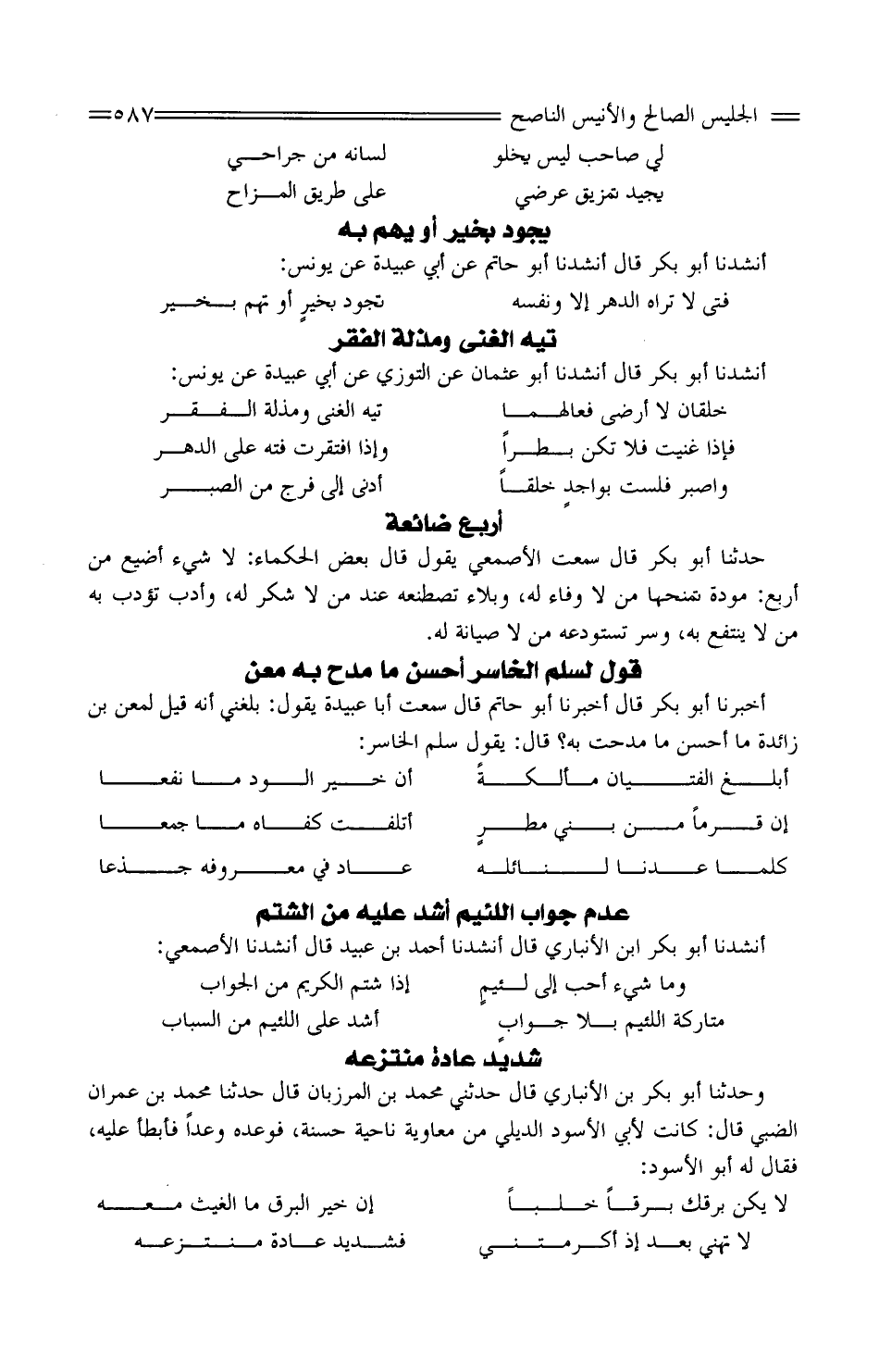 أنشدنا أَبُو بكر قَالَ أنشدنا أَبُو حَاتِم عَنْ أبي عُبَيْدة عَنْ يُونُس: