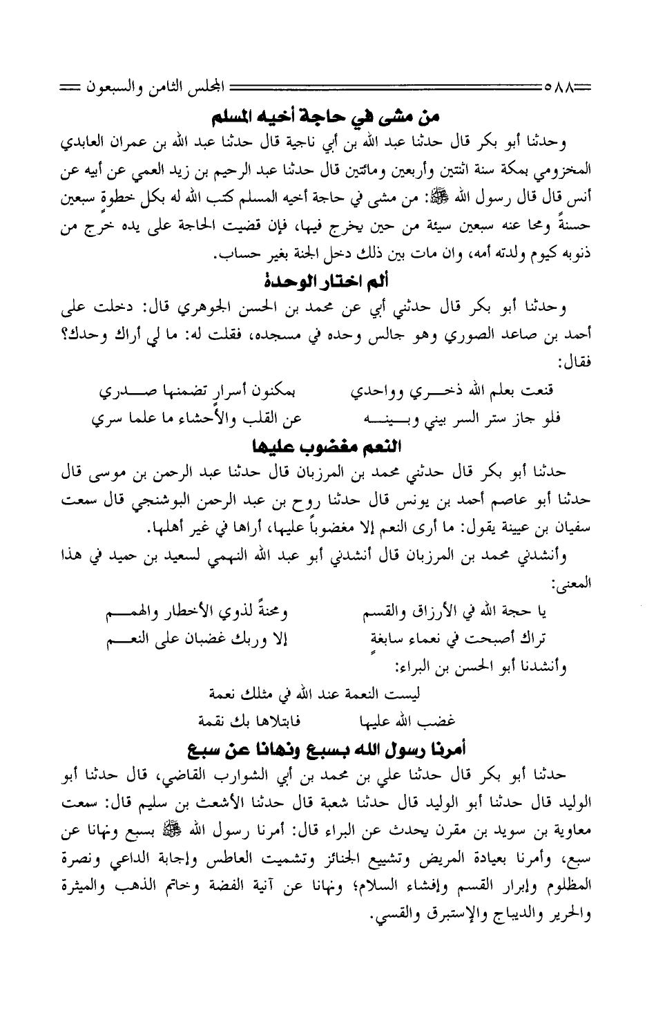 وَحَدَّثَنَا أَبُو بَكْرٍ قَالَ حَدَّثَنَا عَبْدُ اللَّهِ بْنُ نَاجِيَةَ قَالَ حَدَّثَنَا عَبْدُ اللَّهِ بْنُ عِمْرَانَ العابدي المَخْزُومِي بِمَكَّة سنتة اثْنَتَيْنِ وَأَرْبَعِينَ وَمِائَتَيْنِ قَالَ حَدَّثَنَا عَبْدُ الرَّحِيمِ بْنِ زَيْدٍ الْعَمِّيُّ عَنْ أَبِيهِ عَنْ أَنَسٍ قَالَ قَالَ رَسُولُ اللَّهِ صَلَّى اللَّهُ عَلَيْهِ وَسَلَّمَ: مَنْ مَشَى فِي حَاجَةِ أَخِيهِ الْمُسْلِمِ كَتَبَ اللَّهُ لَهُ بِكُلِّ خطوةٍ سَبْعِينَ حَسَنَةً وَمَحَا عَنْهُ سَبْعِينَ سَيِّئَةً مِنْ حِينِ يَخْرُجُ فِيهَا، فَإِنْ قُضِيَتِ الْحَاجَةُ عَلَى يَدِهِ خَرَجَ مِنْ ذُنُوبِهِ كَيَوْمِ وَلَدَتْهُ أُمُّهُ، وَإِنْ مَاتَ بَيْنَ ذَلِكَ دَخَلَ الْجَنَّةَ بِغَيْر حِسَاب.