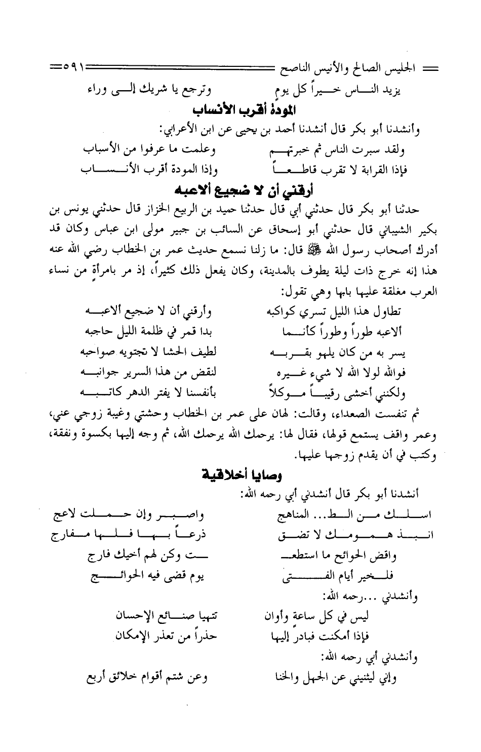 وأنشدنا أَبُو بكر قَالَ أنشدنا أَحْمَد بْن يحيى عَن ابْن الْأَعرَابِي: