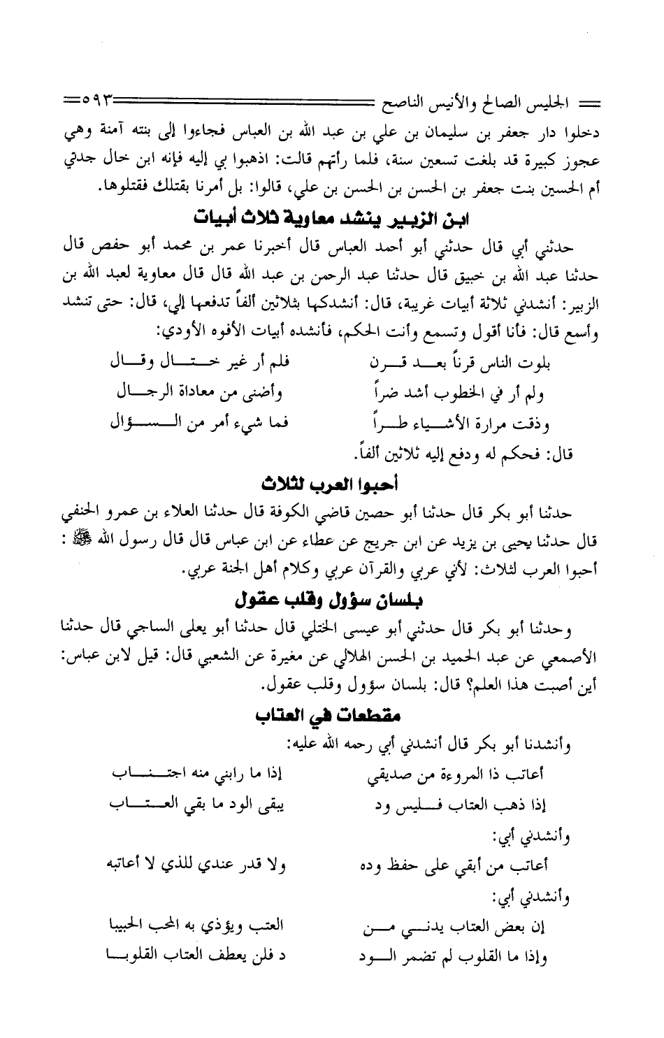 حَدَّثَنِي أَبِي قَالَ حَدَّثَنِي أَبُو أَحْمَد الْعَبَّاسُ قَالَ أَخْبَرَنَا عُمَرُ بْنُ مُحَمَّدٍ أَبُو حَفْصٍ قَالَ حَدَّثَنَا عَبد اللَّه بْن خبيق قَالَ حَدَّثَنَا عَبْدُ الرَّحْمَنِ بْنُ عَبْدِ اللَّهِ قَالَ قَالَ مُعَاوِيَةُ لِعَبْدِ اللَّهِ بْنِ الزُّبَيْرِ: أَنْشِدْنِي ثَلاثَةَ أَبْيَاتٍ غَرِيبَةٍ، قَالَ: أُنْشِدُكَهَا بِثَلاثِينَ أَلْفًا تَدْفَعُهَا إِلَيَّ، قَالَ: حَتَّى تُنْشِدَ وَأَسْمَعَ، قَالَ: فَأَنَا أَقُولُ وَتَسْمَعُ وَأَنْتَ الْحَكَمُ، فَأَنْشَدَهُ أَبْيَاتٍ الأَفْوَهِ الأَوْدِيِّ: