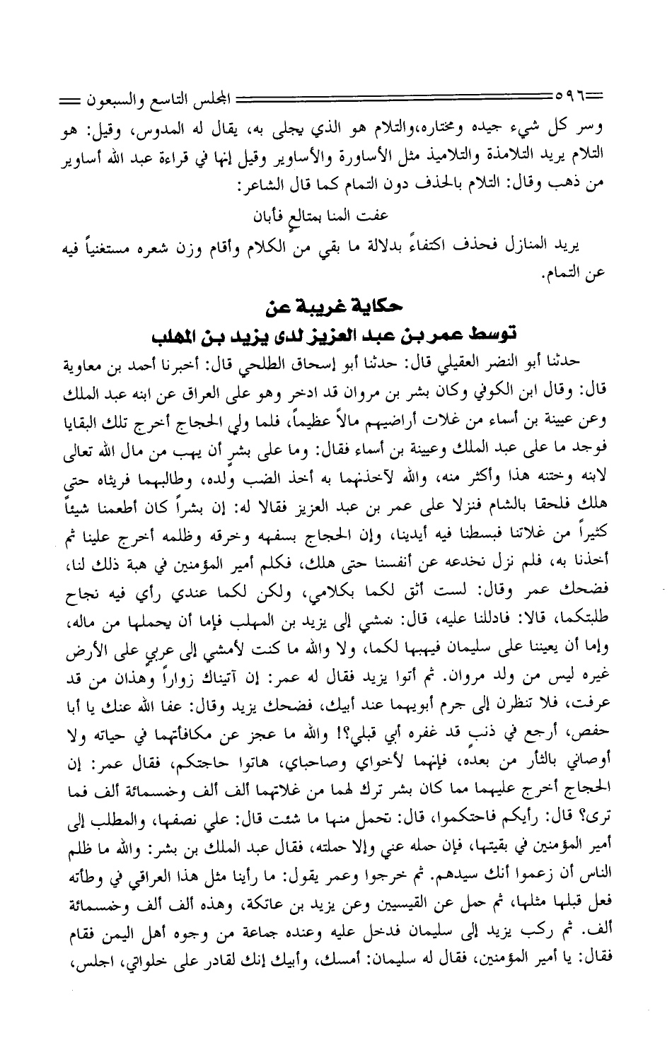 حَدَّثَنَا أَبُو النَّضْر الْعُقَيْليّ قَالَ: حَدَّثَنَا أَبُو إِسْحَاق الطَّلْحي قَالَ: أَخْبَرَنَا أَحْمَد بْن مُعَاوِيَة قَالَ: وَقَالَ ابْن الْكُوفِي وَكَانَ بشر بْن مَرْوَان قد ادخر وَهُوَ على الْعرَاق عَن ابْنه عبد الْملك وَعَن عُيَيْنَة بْن أَسمَاء من غلات أراضيهم مَالا عَظِيما، فَلَمَّا ولي الْحجَّاج أخرج تِلْكَ البقايا فَوجدَ مَا على عبد الْملك وعيينة بْن أَسمَاء فَقَالَ: وَمَا على بشرٍ أَن يهب من مَال الله تَعَالَى لِابْنِهِ وَخَتنه هَذَا وَأكْثر مِنْهُ، وَالله لآخذنهما بِهِ أَخذ الضَّب وَلَده، وطالبهما فريثاه حَتَّى هلك فلحقا بِالشَّام فَنزلَا على عمر بْن عبد الْعَزِيز فَقَالَا لَهُ: إِن بشرا كَانَ أطعمنَا شَيْئا كثيرا من غلاتنا فبسطنا فِيهِ أَيْدِينَا، وان الْحجَّاج بسفهه وخرقه وظلمه أخرج علينا ثُمَّ أَخذنَا بِهِ، فَلم نزل نخدعه عَن أَنْفُسنَا حَتَّى هلك، فَكلم أَمِير الْمُؤمنِينَ فِي هبة ذَلِك لنا، فَضَحِك عمر وَقَالَ: لست أَثِق لَكمَا بكلامي، وَلَكِن لَكمَا عِنْدِي رَأْي فِيهِ نجاح طلبتكما، قَالَا: فادللنا عَلَيْهِ، قَالَ: نمشي إِلَى يزِيد بْن الْمُهلب فإمَّا أَن يحملهَا من مَاله، وَإِمَّا أَن يعيننا على سُلَيْمَان فيهبها لَكمَا، وَلَا وَالله مَا كنت لأمشي إِلَى عربيٍ على الأَرْض غَيره لَيْسَ من ولد مَرْوَان. ثُمَّ أَتَوا يزِيد فَقَالَ لَهُ عمر: إِن اأتيناك زوارا وَهَذَانِ من قد عرفت، فَلَا تنظرن إِلَى جرم أَبُو يهما عِنْد أَبِيك، فَضَحِك يزِيد وَقَالَ: عَفا الله عَنْك يَا أَبَا حَفْص، أرجع فِي ذنبٍ قد غفره أَبِي قبلي؟! وَالله مَا عجز عَن مكافأتهما فِي حَيَاته وَلَا أَوْصَانِي بالثأر من بعده، فَإِنَّهُمَا لأخواي وصاحباي، هاتوا حَاجَتكُمْ، فَقَالَ عمر: إِن الْحجَّاج أخرج عَلَيْهِمَا مِمَّا كَانَ بشر ترك لَهما من غلاتهما ألف ألف وَخَمْسمِائة ألف فَمَا ترى؟ قَالَ: رَأْيكُمْ فاحتكموا، قَالَ: تحمل مِنْهَا مَا شِئْت قَالَ: عَليّ نصفهَا، وَالْمطلب إِلَى أَمِير الْمُؤمنِينَ فِي بقيتها، فَإِن حمله عني وَإِلَّا حَملته، فَقَالَ عبد الْملك بْن بشر: وَالله مَا ظلم النَّاس أَن زَعَمُوا أَنَّك سيدهم. ثُمَّ خَرجُوا وَعمر يَقُول: مَا رَأينَا مثل هَذَا الْعِرَاقِيّ فِي وطأته فعل قبلهَا مثلهَا، ثمَّ حمل عَن القيسيين وَعَن يزِيد بْن عَاتِكَة، وَهَذِه ألف ألف وَخَمْسمِائة ألف. ثُمَّ ركب يزِيد إِلَى سُلَيْمَان فَدخل عَلَيْهِ وَعِنْده جمَاعَة من وُجُوه أهل الْيمن فَقَامَ فَقَالَ: يَا أَمِير الْمُؤمنِينَ، فَقَالَ لَهُ سُلَيْمَان: أمسك، وَأَبِيك إِنَّك لقادر على خلواتي، اجْلِسْ،