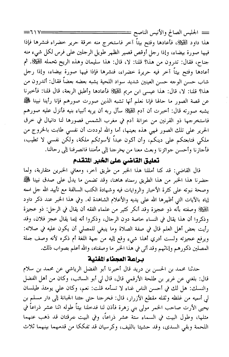 قَالَ القَاضِي: قد كُنَّا أمللنا هَذَا الْخَبَر من طَرِيق آخر، ومعاني الْخَبَرَيْنِ مُتَقَارِبَة، وَلما حَضَرنَا هَذَا الْخَبَر من هَذَا الطَّرِيق رسمناه هَاهُنَا، وَقد تضمن مَا يدل على صدق نَبينَا صلّى اللَّه عَلَيْهِ وَسلم وَصِحَّة نبوته على كَثْرَة الْأَخْبَار وَالرِّوَايَات فِيهِ وَشَهَادَة الْكتب السالفة مَعَ تأييد الله جلّ اسْمه إِيَّاه بِالْآيَاتِ الَّتِي أظهرها الله على يَدَيْهِ والأعلام الشاهدة لَهُ. وَفِي هَذَا الْخَبَر عِنْد ذكر دَاوُد عَلَيْهِ السَّلَام وَصفته بِأَنَّهُ ذُو عجيزة وَقد أنكر كثير من عُلَمَاء الْفِقْه أَن يُقَال فِي الرجل: ذُو عجيزة وَذكروا أَن هَذَا يُقَال فِي النِّسَاء خَاصَّة دون الرِّجَال، وَذكروا أَنه إِنَّمَا يُقَال عجز فلَان، وَقد رَأَيْت بعض أهل الْعلم قَالَ فِي صفة الصَّلَاة وَمَا يَنْبَغِي للْمُصَلِّي أَن يكون عَلَيْهِ فِي صلَاته: وَيرْفَع عجيزته وَلست أَدْرِي أَهَذا شَيْء وَقع إِلَيْهِ من جِهَة اللُّغَة أم ذكره لِأَنَّهُ وصف جملَة الْمُصَلِّين ذكورهم وإناثهم وَقد أَتَى فِي هَذَا الْخَبَر مَا وصفناه، وَالله أعلم بصواب ذَلِك.