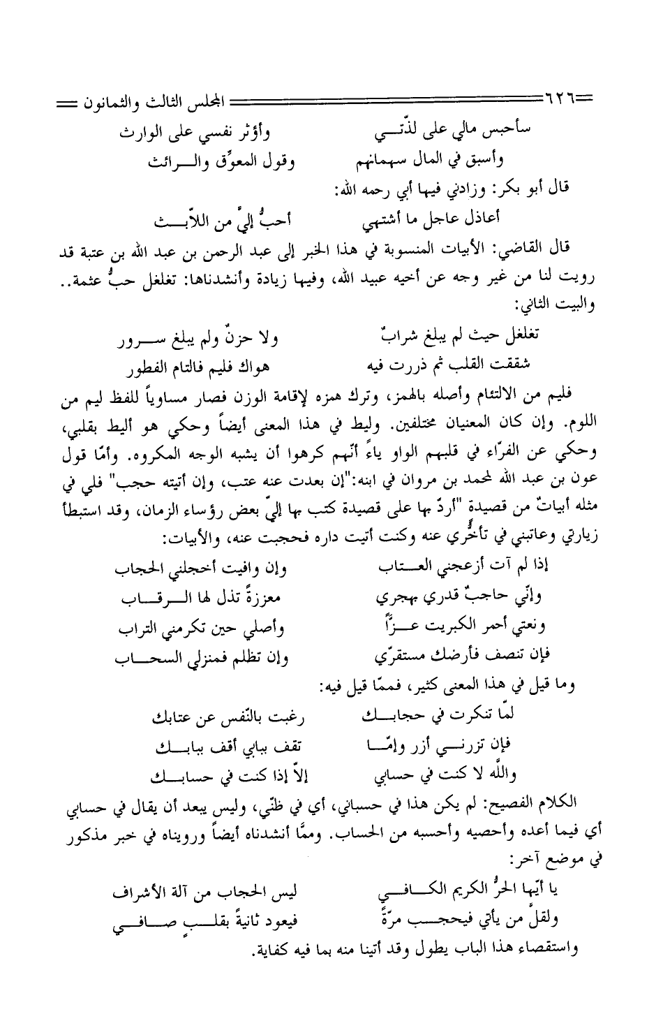 يَا أيُّها الحرُّ الكريمُ الْكَافِي ... لَيْسَ الحجابُ من آلةِ الأشرافِ