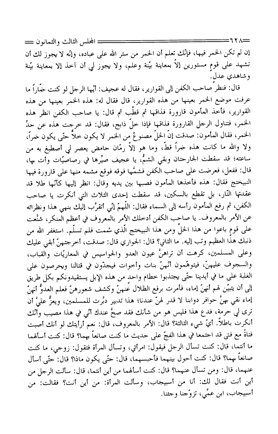 قَالَ: فَنظر صاحبُ الْكَفَن إِلَى الْقَوَارِير، فَقَالَ لَهُ عجيف: أيُّها الرجل لَو كنت خمّارًا مَا عرفت مَوضِع الْخمر بِعَينهَا من هَذِه الْقَوَارِير، قَالَ فَقَالَ لَهُ: هَذِه الْخمر بِعَينهَا من هَذِه الْقَوَارِير، فَأخذ الْمَأْمُون قَارُورَة فذاقها ثُمَّ قطَّب ثُمَّ قَالَ: يَا صَاحب الْكَفَن انْظُر هَذِه الْخمر، فَتَنَاول الرجل القارورة فذاقها فَإِذا خلُّ ذابح، فَقَالَ: قد خرجت هَذِه عَن حدِّ الْخمر، فَقَالَ الْمَأْمُون: صدقت إنَّ الخلّ مصنوعٌ من الْخمر لَا يكون خلًّا حَتَّى يكون خمرًا، وَلَا وَالله مَا كَانَت هَذِه خمرًا قطّ، وَمَا هُوَ إِلَّا رُمّان حامض يعصر لي أصطبغُ بِهِ من سَاعَته؛ قد سَقَطَتِ الجارحتان وبقيَ الشمُّ، يَا عُجيف صيِّرها فِي رصاصيّات وَأت بِهَا، قَالَ: فَفعل، فعُرضت على صَاحب الْكَفَن فشمَّها فَوْقه فَوَقع مَشَمُّه مِنْهَا على قَارُورَة فِيهَا لبيختبج فَقَالَ: هَذِه فَأَخذهَا الْمَأْمُون فصبَّها بَين يَدَيْهِ وَقَالَ: انْظُر إِلَيْهَا كأنَّها طلا قد عقدتها النَّار، بَلْ تُقْطَعُ بالسكين، قد سَقَطت إِحْدَى الثَّلَاث الَّتِي أنْكرت يَا صَاحب الْكَفَن، ثُمَّ رفع الْمَأْمُون رَأسه إِلَى السَّمَاء فَقَالَ: اللَّهُمَّ إِنِّي أتقرَّب إِلَيْك بنهي هَذَا ونظرائه عَن الْأَمر بِالْمَعْرُوفِ. يَا صَاحب الْكَفَن أدْخلك الْأَمر بِالْمَعْرُوفِ فِي أعظم الْمُنكر، شنَّعت على قومٍ باعوا من هَذَا الخلِّ وَمن هَذَا النبيختج الَّذِي شممت فَلم تسلّم. اسْتغْفر الله من ذَنْبك هَذَا الْعَظِيم وَتب إِلَيْهِ. مَا الثَّانِي؟ قَالَ: الْجَوَارِي قَالَ: صدقت، أخرجتهنّ أبقى عَلَيْك وعَلى الْمُسلمين، كرهتُ أَن تراهنَّ عيونُ الْعَدو والجواسيس فِي المعاريّات والقباب، والسجوف عليهنّ، فيتوهّمون أنهنّ بَنَات وأخوات فيجدون فِي قتالنا ويحرصون على الْغَلَبَة على مَا فِي أَيْدِينَا حَتَّى يجتذبوا خطامَ واحدٍ من هَذِه الْإِبِل يستقيدونكم بِكُل طَرِيق إِلَى أَن يتَبَيَّن لَهُم أنهنَّ إِمَاء، فَأمرت بِرَفْع الظلال عَنْهُن وكشف شعورهن فَعلم العدوُّ أَنَّهُنَّ إِمَاء نقي بهنَّ حوافر دوابنا لَا قدر لهنّ عندنَا؛ هَذَا تَدْبِير دبَّرت للْمُسلمين، ويعزُّ عليَّ أَن ترى لي حُرْمَة، فدع هَذَا فَلَيْسَ هُوَ من شَأْنك فقد صحَّ عنْدك أَنِّي فِي هَذَا مُصِيب وَأَنَّك أنكرتَ بَاطِلا. أيّ شَيْء الثَّالِثَة؟ قَالَ: الأمرُ بِالْمَعْرُوفِ، قَالَ: نعم أرأيتك لَو أَنَّك أصبت فتاةً مَعَ فَتى قد اجْتمعَا فِي هَذَا الفجّ على حَدِيث مَا كنت صانعًا بِهما؟ قَالَ: كنتُ أسألهما مَا أَنْتُمَا، قَالَ: كنت تسألُ الرجل فَيَقُول: امْرَأَتي، وتسألُ الْمَرْأَة فَتَقول: زَوجي، مَا كنت صانعًا بِهما؟ قَالَ: كنتُ أحولُ بَينهمَا فأحبسهما، قَالَ: حَتَّى يكون مَاذَا؟ قَالَ: حَتَّى أسأَل عَنْهُمَا، قَالَ: وَمن تسْأَل عَنْهُمَا؟ قَالَ: كنت أسألهما من أَيْن أَنْتُمَا، قَالَ: سألتُ الرجل من أَيْن أَنْت فَقَالَ لَك: أَنا من أسبيجاب، وسألتُ الْمَرْأَة: من أَيْن أَنْت؟ فَقَالَت: من أسبيجاب، ابْن عمِّي، تزوّجنا وَجِئْنَا.