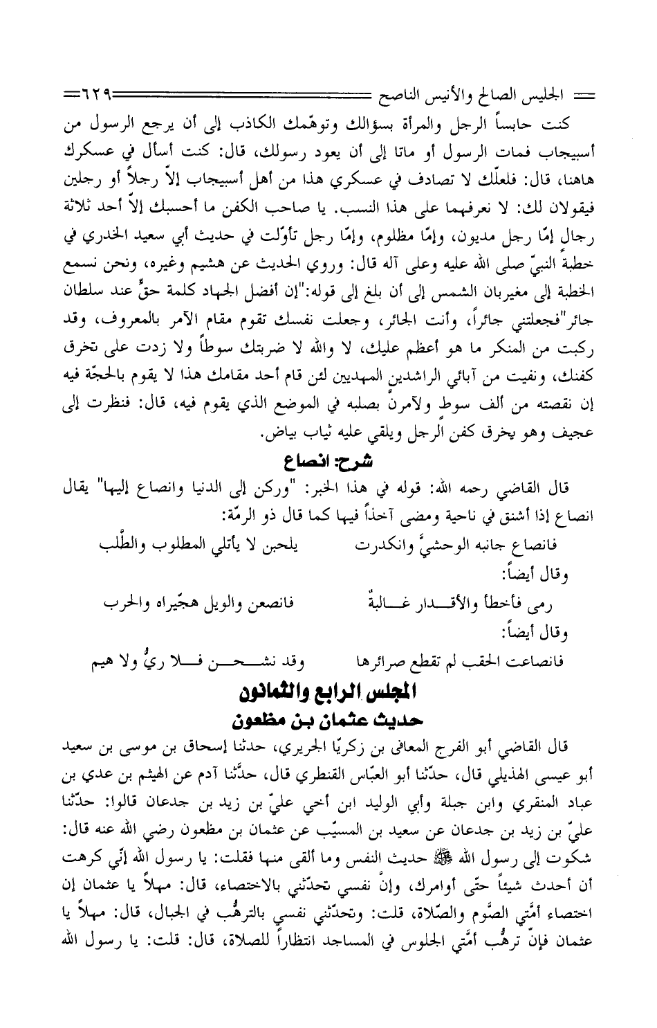 قَالَ الْقَاضِي أَبُو الْفَرَجِ الْمُعَافَى بْنُ زَكَرِيَّا الْجَرِيرِيُّ، حَدَّثَنَا إِسْحَاقُ بْنُ مُوسَى بْنِ سَعِيدٍ أَبُو عِيسَى الْهُذَيْلِيُّ قَالَ، حَدَّثَنَا أَبُو الْعَبَّاسِ الْقَنْطَرِيُّ قَالَ، حدَّثنا آدَمُ عَنِ الْهَيْثَمِ بْنِ عَدِيٍّ بن عَبَّادٍ الْمِنْقَرِيِّ وَابْنِ جَبَلَةَ وَأَبِي الْوَلِيدِ ابْنِ أَخِي عَلِيِّ بْنِ زَيْدِ بْنِ جُدْعَانَ قَالُوا: حَدَّثَنَا عَلِيِّ بْنِ زَيْدِ بْنِ جُدْعَانَ عَنْ سَعِيدِ بْنِ الْمُسَيِّبِ عَنْ عُثْمَانَ بْنِ مَظْعُونٍ رَضِيَ اللَّهُ عَنْهُ قَالَ: شَكَوْتُ إِلَى رَسُولِ اللَّهِ صَلَّى اللَّهُ عَلَيْهِ وَسَلَّمَ حَدِيثَ النَّفْسِ وَمَا أَلْقَى مِنْهَا فَقُلْتُ: يَا رَسُولَ اللَّهِ إِنِّي كَرِهْتُ أَنْ أُحْدِثَ شَيْئًا حَتَّى أُوَامِرَكَ، وإنَّ نَفْسِي تُحَدِّثُنِي بِالاخْتِصَاءِ، قَالَ: مَهْلا يَا عُثْمَانُ إِنَّ اخْتِصَاءَ أمَّتي الصَّوم وَالصَّلاةُ، قُلْتُ: وَتُحَدِّثُنِي نَفْسِي بالترهُّب فِي الْجِبَالِ، قَالَ: مَهْلا يَا عُثْمَانُ فَإِنَّ ترهُّب أمَّتي الْجُلُوسُ فِي الْمَسَاجِدِ انْتِظَارًا لصَلاةٍ، قَالَ: قُلْتُ: يَا رَسُولَ اللَّهِ