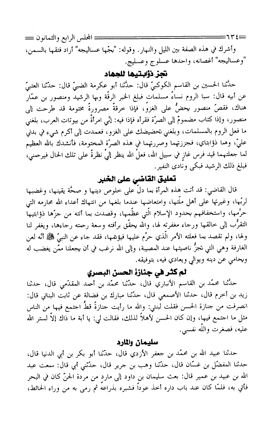 حدَّثنا الْحُسَيْن بن الْقَاسِم الكوكبيّ قَالَ: حدَّثنا أَبُو عِكْرِمَة الضبيّ قَالَ: حَدَّثَنَا العتبيّ عَن أَبِيه قَالَ: سبا الرّوم نسَاء مسلماتٍ فَبلغ الْخَبَر الرقَّةَ وَبِهَا الرشيد وَمَنْصُور بن عمار هُنَاكَ، فقصّ مَنْصُور يحضُّ على الْغَزْو، فَإِذا خرقةٌ مصرورةٌ مختومة قد طُرحت إِلَى مَنْصُور، وَإِذا كتاب مضمومٌ إِلَى الصرة فقرأه فَإِذا فِيهِ: إِنِّي امرأةٌ من بيوتات الْعَرَب، بَلغنِي مَا فعل الرّوم بالمسلمات، وَبَلغنِي تحضيضك على الْغَزْو، فعمدت إِلَى أكْرم شَيْء فِي بدني عليّ، وهما ذؤابتاي، فجززتَهما وصررتهما فِي هَذِه الصرة المختومة، فأنشدك بِاللَّه الْعَظِيم لما جعلتهما قَيْدَ فرس غازٍ فِي سَبِيل الله، فعلَّ الله ينظر إليَّ نظرةً على تِلْكَ الْحَال فيرحمني، فَبلغ ذَلِكَ الرشيد فَبكى ونادى النفير.