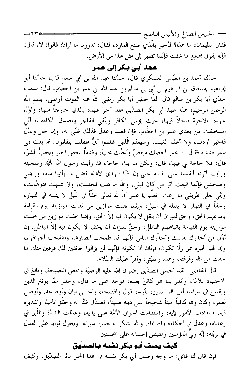 حدَّثنا أَحْمَدُ بْنُ الْعَبَّاسِ الْعَسْكَرِيُّ قَالَ، حدَّثنا عَبْدُ اللَّهِ بْن أبي سَعْد قَالَ، حدَّثنا أَبُو إِبْرَاهِيمَ إِسْحَاقُ بْنُ إِبْرَاهِيمَ بن أبي بْنِ سَالِمِ بْنِ عَبْدِ اللَّهِ بْنِ عُمَرَ بْنِ الْخَطَّابِ قَالَ: سَمِعْتُ جَدِّي أَبَا بَكْرِ بْنَ سَالِمٍ قَالَ: لمَّا حَضَرَ أَبَا بَكْرٍ رَضِيَ اللَّهُ عَنْهُ الْمَوْتُ أَوْصَى: بِسْمِ اللَّهِ الرَّحْمَنِ الرَّحِيمِ، هَذَا عَهْدُ أَبِي بَكْرٍ الصِّدِّيقِ عِنْدَ آخِرِ عَهْدِهِ بِالدُّنْيَا خَارِجًا مِنْهَا، وَأَوَّلُ عَهْدِهِ بِالآخِرَةِ دَاخِلا فِيهَا، حَيْثُ يُؤْمِنُ الْكَافِرُ وَيَتَّقِي الْفَاجِرُ وَيُصَدِّقُ الْكَاذِبُ، أَنِّي اسْتَخْلَفْتُ مِنْ بَعْدِي عُمَرَ بْنَ الْخَطَّابِ فَإِنْ قَصَدَ وَعَدَلَ فَذَلِكَ ظَنِّي بِهِ، وَإِنْ جَارَ وبدَّل فَالْخَيْرَ أَرَدْتُ، وَلا أَعْلَمُ الْغَيْبَ، وَسَيَعْلَمُ الَّذِينَ ظَلَمُوا أيَّ مُنْقَلَبٍ يَنْقَلِبُونَ. ثُمَّ بَعَثَ إِلَى عُمَرَ فَدَعَاهُ فَقَالَ: يَا عُمَرُ أَبْغَضَكَ مبغضٌ وأحبَّك محبّ، وقدماً يُبْغَضُ الْخَيْرُ ويحبُّ الشَّرُّ، قَالَ: فَلا حَاجَةَ لِي فِيهَا، قَالَ: وَلَكِنْ لَهَا بِكَ حَاجَةٌ، قَدْ رَأَيْتُ رَسُولَ اللَّهِ صَلَّى اللَّهُ عَلَيْهِ وَسَلَّمَ وَصَحِبْتُهُ وَرَأَيْتُ أَثَرَتَهُ أَنْفُسَنَا عَلَى نَفْسِهِ حَتَّى إِنْ كُنَّا لَنُهْدِي لأَهْلِهِ فَضْلَ مَا يَأْتِينَا مِنْهُ، وَرَأَيْتَنِي وَصَحِبْتَنِي فَإِنَّمَا اتَّبَعْتُ أَثَرَ مَنْ كَانَ قَبْلِي، وَاللَّهِ مَا نِمْتُ فَحَلَمْتُ، وَلا شَبَّهْتُ فتوهَّمت، وَإِنِّي لَعَلَى طَرِيقِي مَا زُغْتُ. تعلَّم يَا عُمَرُ أنّ الله تَعَالَى حَقًّا فِي اللَّيْلِ لَا يَقْبَلُهُ فِي النَّهَارِ، وَحَقًّا فِي النَّهَارِ لَا يَقْبَلُهُ فِي اللَّيْلِ، وَإِنَّمَا ثَقُلَتْ مَوَازِينُ مَنْ ثَقُلَتْ مَوَازِينُهُ يَوْمَ الْقِيَامَةِ بِاتِّبَاعِهِمُ الْحَقَّ، وَحَقَّ لِمِيزَانٍ أَنْ يَثْقُلَ لَا يَكُونُ فِيهِ إِلا الْحَقُّ، وَإِنَّمَا خَفَّتْ مَوَازِينُ مَنْ خفَّت مَوَازِينُهُ يَوْمَ الْقِيَامَةِ بِاتِّبَاعِهِمُ الْبَاطِلَ، وَحَقَّ لِمِيزَانٍ أَنْ يَخِفَّ لَا يَكُونُ فِيهِ إِلا الْبَاطِلُ. إِنَّ أَوَّلَ مَنْ أُحَذِّرُكَ نَفْسُكَ وَأُحَذِّرُكَ النَّاسَ فَإِنَّهُمْ قَدْ طَمَحَتْ أَبْصَارُهُمْ وَانْتَفَجَتْ أَجْوَافُهُمْ، وَإِنَّ لَهُمْ لَحِيزَةً عَنْ زلَّة تَكُونُ، فَإِيَّاكَ أَنْ تَكُونَهُ فَإِنَّهُمْ لَنْ يَزَالُوا خَائِفِينَ لَكَ فَرِقِينَ مِنْكَ مَا خِفْتَ مِنَ اللَّهِ وَفَرِقْتَهُ، وَهَذِهِ وَصِيَّتِي، وَأَقْرَأُ عَلَيْكَ السَّلام.