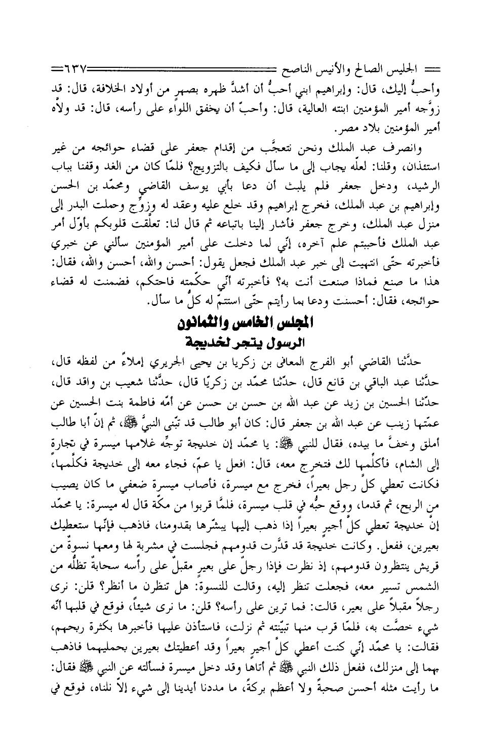 حدَّثنا الْقَاضِي أَبُو الْفَرَجِ الْمُعَافَى بْنُ زَكَرِيَّا بْنِ يَحْيَى الْجَرِيرِيُّ إِمْلاءً مِنْ لَفْظِهِ قَالَ، حدَّثنا عَبْد الْبَاقِي بْن قَانِع قَالَ، حَدَّثَنَا مُحَمَّد بْن زَكَرِيّا قَالَ، حدَّثنا شُعَيْبُ بْنُ وَاقِدٍ قَالَ، حَدَّثَنَا الْحُسَيْنُ بْنُ زَيْدٍ عَنْ عَبْد اللَّه بْن حَسَن بْن حَسَنٍ عَنْ أُمِّهِ فَاطِمَةَ بِنْتِ الْحُسَيْنِ عَنْ عَمَّتِهَا زَيْنَبَ عَنْ عَبد اللَّه بْن جَعْفَر قَالَ: كَانَ أَبُو طَالِبٍ قَدْ تَبَنَّى النبيَّ صَلَّى اللهُ عَلَيْهِ وَسَلَّمَ، ثُمَّ إِنَّ أَبَا طَالِبٍ أَمْلَقَ وخفَّ مَا بِيَدِهِ، فَقَالَ لِلنَّبِيِّ صَلَّى اللَّهُ عَلَيْهِ وَسَلَّمَ: يَا مُحَمَّدُ إِنَّ خَدِيجَةَ توجِّه غُلامَهَا مَيْسَرَةَ فِي تجارةٍ إِلَى الشَّامِ، فأكلِّمها لَكَ فَتَخْرُجَ مَعَهُ، قَالَ: افْعَلْ يَا عَمُّ، فَجَاءَ مَعَهُ إِلَى خَدِيجَةَ فكلَّمها، فَكَانَتْ تُعْطِي كلَّ رَجُلٍ بَعِيرًا، فَخَرَجَ مَعَ مَيْسَرَةَ، فَأَصَابَ مَيْسَرَةُ ضِعْفَيْ مَا كَانَ يُصِيبُ مِنَ الرِّبْحِ، ثُمَّ قَدِمَا، وَوَقَعَ حبُّه فِي قَلْبِ مَيْسَرَةَ، فلمَّا قَرُبُوا مِنْ مَكَّةَ قَالَ لَهُ مَيْسَرَةُ: يَا مُحَمَّدُ إنَّ خَدِيجَةَ تُعْطِي كلَّ أجيرٍ بَعِيرًا إِ ذَا ذَهَبَ إِلَيْهَا يُبَشِّرُهَا بِقُدُومِنَا، فَاذْهَبْ فَإِنَّهَا سَتُعْطِيكَ بَعِيرَيْنِ، فَفَعَلَ. وَكَانَتْ خَدِيجَةُ قَدْ قدَّرت قُدُومَهُمْ فَجَلَسَتْ فِي مشربةٍ لَهَا وَمَعَهَا نسوةٌ من قُرَيْش ينتظرون قُدُومَهُمْ، إِذْ نَظَرَتْ فَإِذَا رجلٌ عَلَى بعيرٍ مقبلٌ عَلَى رَأْسِهِ سحابةٌ تظلُّه مِنَ الشَّمْسِ تَسِيرُ مَعَهُ، فَجَعَلَتْ تَنْظُرُ إِلَيْهِ، وَقَالَتْ لِلنِّسْوَةِ: هَلْ تَنْظُرْنَ مَا أَنْظُرُ؟ قُلْنَ: نَرَى رَجُلا مُقْبِلا عَلَى بَعِيرٍ، قَالَتْ: فَمَا تَرَيْنَ عَلَى رَأْسِهِ؟ قُلْنَ: مَا نَرَى شَيْئًا، فَوَقَعَ فِي قَلْبِهَا أَنَّهُ شَيْءٌ خصَّت بِهِ، فَلَمَّا قَرُبَ مِنْهَا تَبَيَّنَتْهُ ثُمَّ نَزَلَتْ، فَاسْتَأْذَنَ عَلَيْهَا فَأَخْبَرَهَا بِكَثْرَةِ رِبْحِهِمْ، فَقَالَتْ: يَا مُحَمَّدُ إِنِّي كُنْتُ أُعْطِي كلَّ أجيرٍ بَعِيرًا وَقَدْ أَعْطَيْتُكَ بَعِيرَيْنِ بِحِمْلَيْهِمَا فَاذْهَبْ بِهِمَا إِلَى مَنْزِلِكَ، فَفَعَلَ ذَلِكَ النَّبِيُّ صَلَّى اللَّهُ عَلَيْهِ وَسَلَّمَ ثُمَّ أَتَاهَا وَقَدْ دَخَلَ مَيْسَرَةُ فَسَأَلَتْهُ عَنِ النَّبِيِّ صَلَّى اللَّهُ عَلَيْهِ وَسَلَّمَ فَقَالَ: مَا رَأَيْتُ مِثْلَهُ أَحْسَنَ صُحْبَةً وَلا أَعْظَمَ بَرَكَةً، مَا مَدَدْنَا أَيْدِيَنَا إِلَى شَيْءٍ إِلا نِلْنَاهُ، فَوَقَعَ فِي