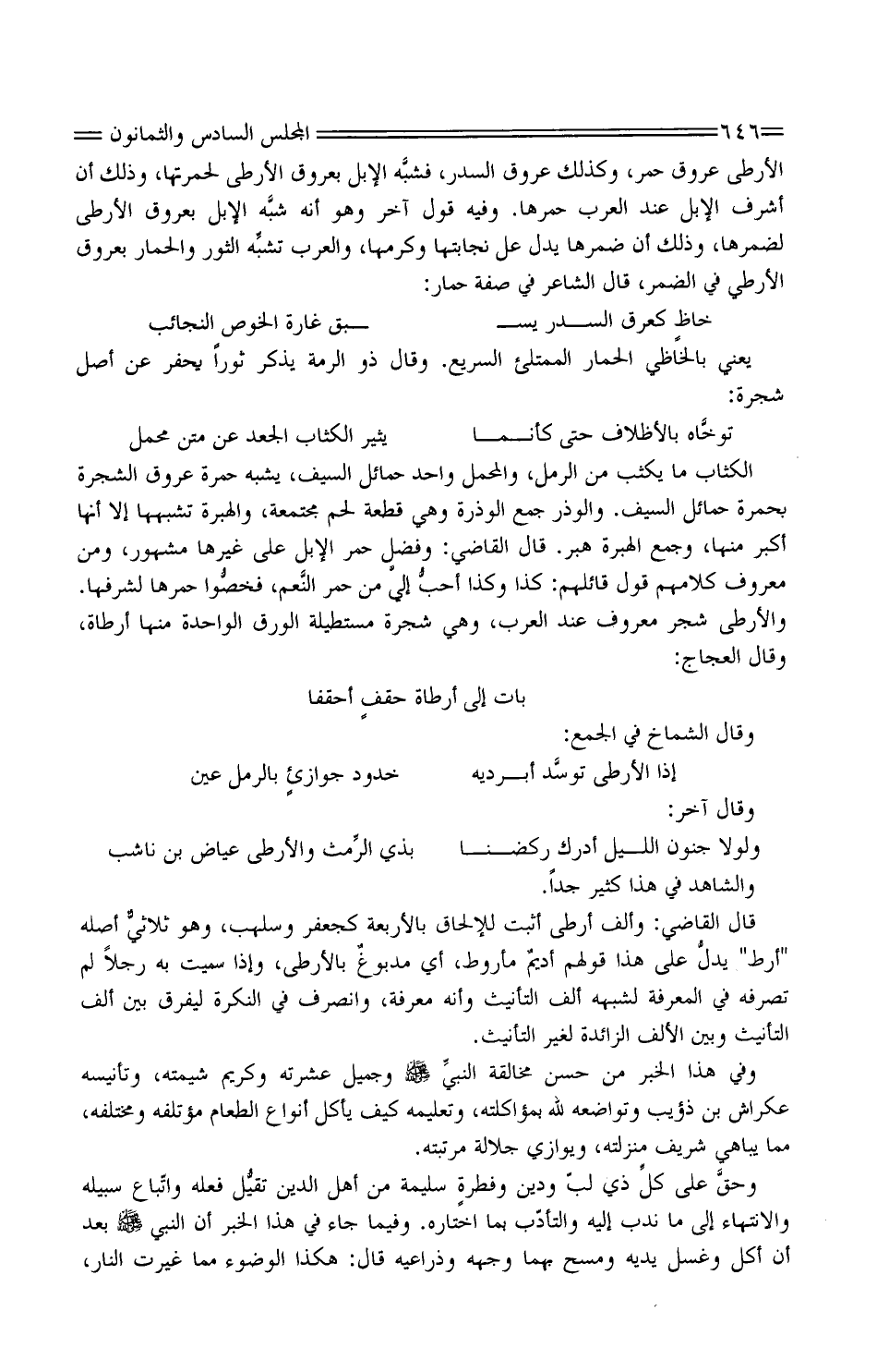 الكثاب مَا يكثب من الرمل، والمحمل وَاحِد حمائل السَّيْف، يشبه حمرةَ عروقِ الشَّجَرَة بحمرة حمائل السَّيْف. والوذر جمع الوذرة وَهِي قِطْعَة لحم مجتمعة، والهبرةُ تشبهها إِلَّا أنَّها أكبرُ مِنْهَا، وَجمع الهبرة هبر. قَالَ القَاضِي: وفضلُ حُمْرِ الإبلِ على غَيرهَا مَشْهُور، وَمن مَعْرُوف كَلَامهم قَول قَائِلهمْ: كَذَا وَكَذَا أحبُّ إليَّ من حُمْرِ النَّعم، فخصُّوا حمرها لشرفها. والأرطى شجرٌ مَعْرُوف عِنْد الْعَرَب، وَهِي شَجَرَة مستطيلة الْوَرق الْوَاحِدَة مِنْهَا أَرْطَاة، وَقَالَ العجاج: