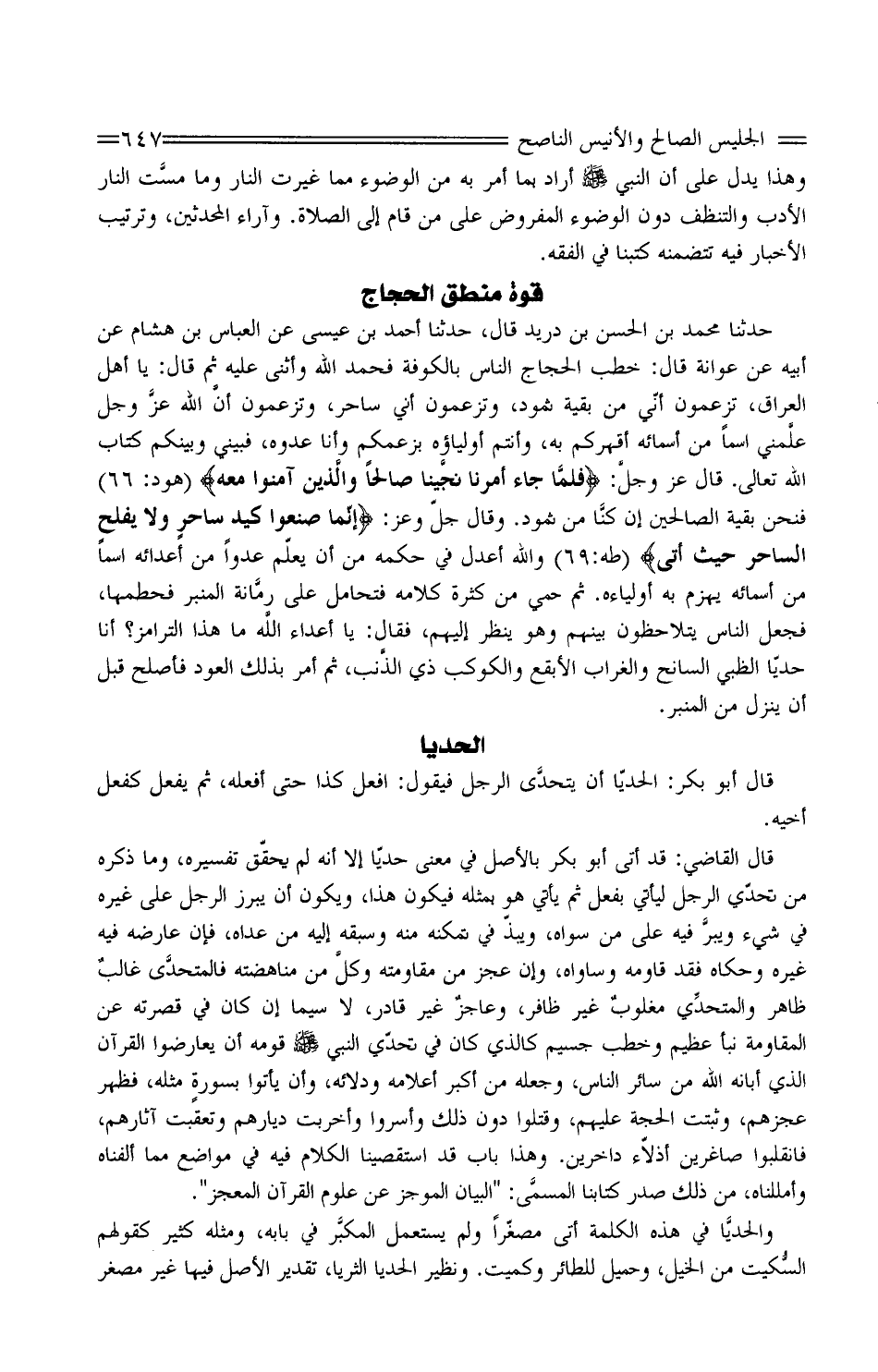حَدَّثَنَا مُحَمَّد بْن الْحَسَن بْن دُرَيْد قَالَ، حَدَّثَنَا أَحْمَد بن عِيسَى عَن الْعَبَّاس بْن هِشَام عَنْ أَبِيه عَن عوَانَة قَالَ: خطب الحجاجُ الناسَ بِالْكُوفَةِ فحمدَ الله وَأثْنى عَلَيْهِ ثُمَّ قَالَ: يَا أهل الْعرَاق، تزعمونَ أنَّا من بَقِيَّة ثَمود، وتزعمون أَنِّي سَاحر، وتزعمون أنَّ الله عزَّ وَجَلَّ علَّمني اسْما من أَسْمَائِهِ أقهركم بِهِ، وَأَنْتُم أولياؤُهُ بزعمكم وَأَنا عدوه، فبيني وَبَيْنكُم كتاب الله تَعَالَى. قَالَ " عَزَّ وجلَّ: " فلمَّا جَاءَ أَمْرُنَا نجَّينا صَالِحًا والَّذين آمَنُوا مَعَهُ " هود " 66 " فنحنُ بقيةُ الصالِحين إنْ كنَّا من ثَمود. وَقَالَ جلّ وَعز: " إِنَّمَا صَنَعُوا كَيْدُ ساحرٍ وَلا يُفْلِحُ السَّاحِرُ حَيْثُ أَتَى " " طه:69 " وَالله أعدلُ فِي حكمه من أَن يعلّمَ عدوا من أعدائِهِ اسْما من أَسْمَائِهِ يهزمُ بِهِ أولياءه. ثُمَّ حَمِيَ من كَثْرَة كَلَامه فتحامل على رمَّانة الْمِنْبَر فحطمها، فَجعل النَّاس يتلاحظونَ بَينهم وَهُوَ ينظرُ إِلَيْهِم، فَقَالَ: يَا أَعدَاء اللَّه مَا هَذَا الترامز؟ أَنا حُدَيا الظبي السانحِ والغرابِ الأبقع والكوكب ذِي الذَّنب، ثُمَّ أَمر بذلك العودِ فأُصْلِح قبل أَن ينزل من الْمِنْبَر.