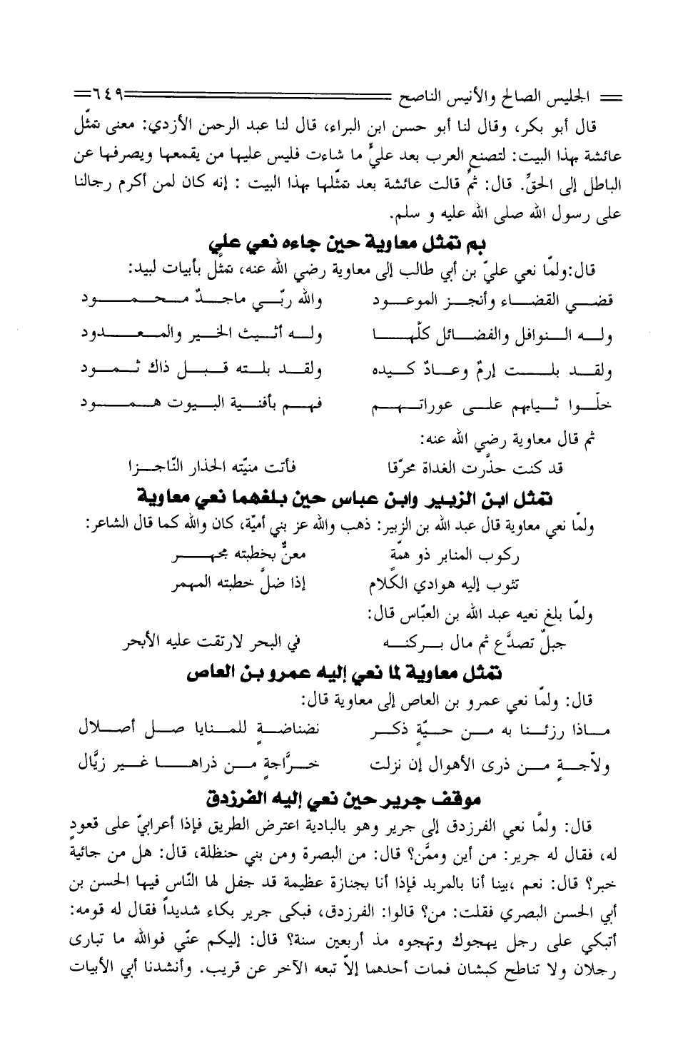 قَالَ: ولَمَّا نُعِي عَلِيُّ بْنُ أَبِي طَالِبٍ إِلَى مُعَاوِيَة رَضِيَ اللَّهُ عَنْهُ، تمثَّل بِأَبْيَات لبيد: