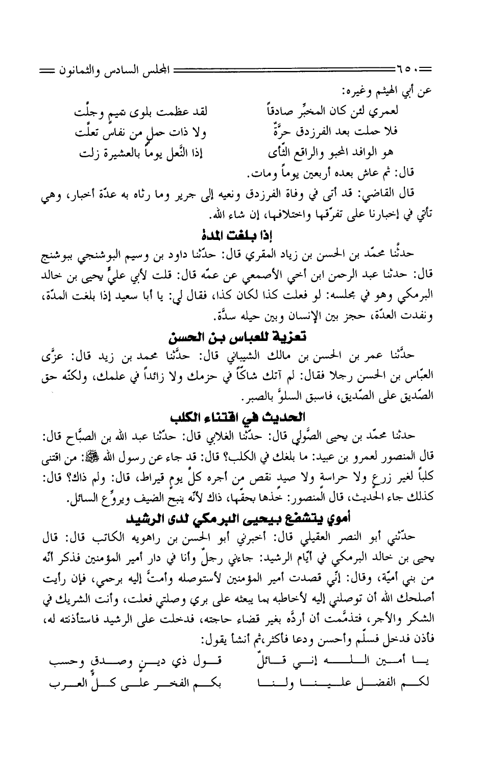 حَدَّثَنِي أَبُو النَّصْر الْعقيلِيّ قَالَ: أَخْبَرَنِي أَبُو الْحَسَن بن رَاهَوَيْه الْكَاتِب قَالَ: قَالَ يَحْيَى بن خَالِد الْبَرْمَكِي فِي أَيَّام الرشيد: جَاءَنِي رجلٌ وَأَنا فِي دَار أَمِير الْمُؤمنِينَ فذكرَ أَنَّهُ من بني أميَّة، وَقَالَ: إِنِّي قصدتُ أَمِير الْمُؤمنِينَ لاستوصله وأمتَّ إِلَيْهِ برحمي، فَإِن رأيتَ أصلحكَ الله أَن توصلني إِلَيْهِ لأخاطبه بِما يَبْعَثهُ على بري وصلتي فعلتَ، وَأَنت الشريكُ فِي الشُّكْر وَالْأَجْر، فتذمَّمت أَن أردَّه بِغَيْر قَضَاء حَاجته، فدخلتُ على الرشيد فاستأذنته لَهُ، فَأذن فَدخل فسلَّم وَأحسن ودعا فَأكْثر، ثُمَّ أنشأ يَقُول: