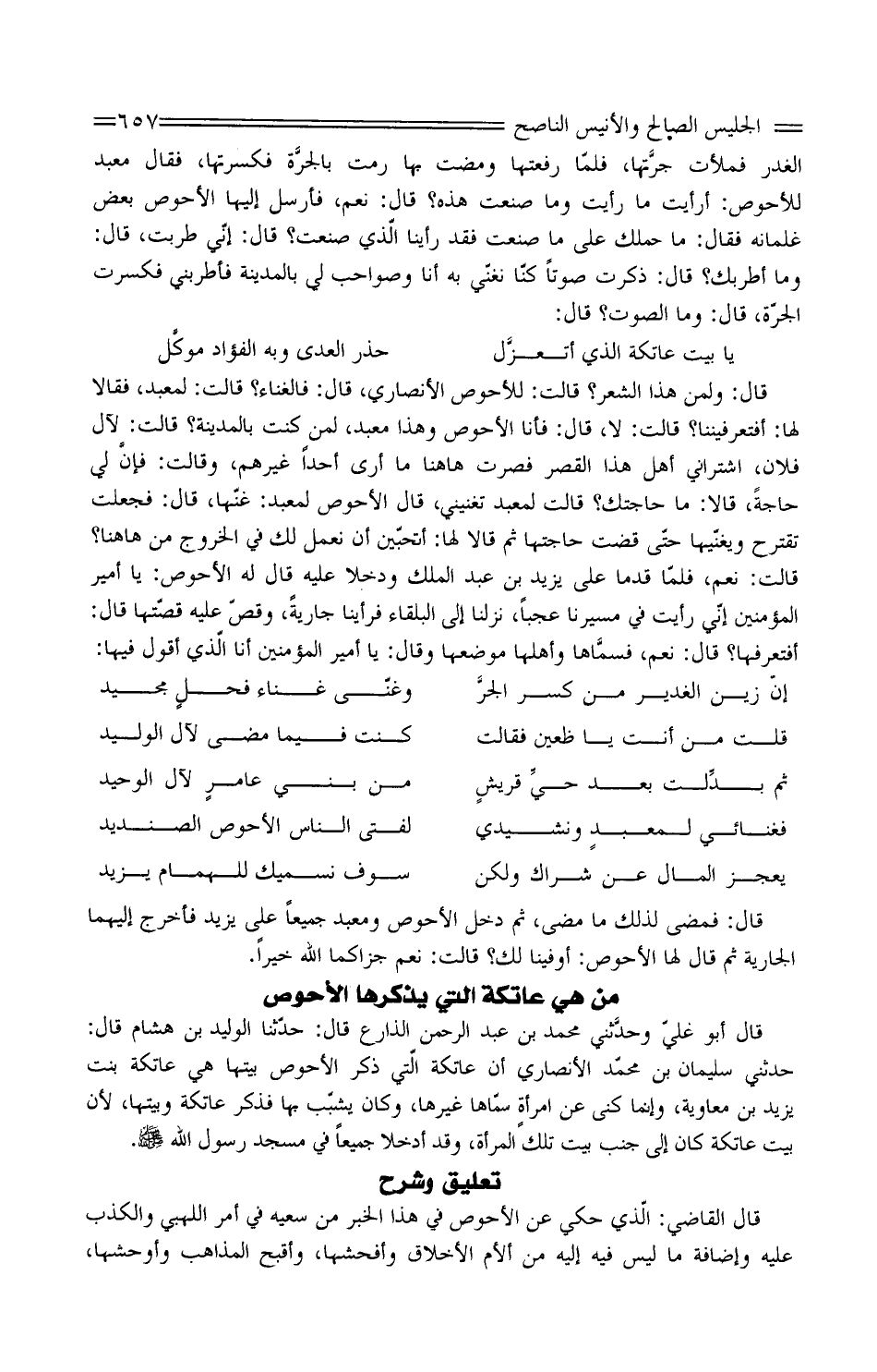 قَالَ: فَمضى لذَلِك مَا مضى، ثُمَّ دخلَ الْأَحْوَص ومعبد جَميعًا على يزِيد فَأخْرج إِلَيْهِمَا الْجَارِيَة ثُمَّ قَالَ لَهَا الْأَحْوَص: أوفينا لَك؟ قَالَت: نعم جزاكما الله خيرا.