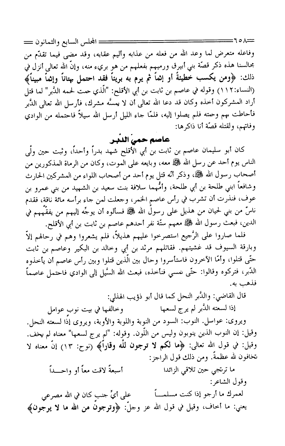 وفاعله متعرض لِما وعد الله من فعله من عَذَابه وأليم عِقَابه، وَقد مضى فِيمَا تقدّم من مجالسنا هَذِه ذكر قصَّة بني أُبَيْرِق ورميهم بفعلهم من هُوَ بَرِيء مِنْهُ، وَإِن الله تَعَالَى أنزلَ فِي ذَلِكَ: " وَمَنْ يَكْسِبْ خَطِيئَةً أَوْ إِثْمًا ثُمَّ يَرْمِ بِهِ بَرِيئًا فَقَدِ احْتَمَلَ بُهْتَانًا وَإِثْمًا مُبِينًا " " النِّسَاء:112 " وَقَوله فِي عَاصِم بن ثَابت بن أبي الأقلح: " الَّذِي حمت لَحْمَه الدَّبر " لما قُتل أَرَادَ الْمُشْركُونَ أَخذه وَكَانَ قد دَعَا الله تَعَالَى أَن لَا يمسَّه مُشْرك، فأرسلَ الله تَعَالَى الدَّبر فأحاطت بِهم وحَمَتْهُ فَلم يصلوا إِلَيْهِ، فلمّا جَاءَ الليلُ أرسلَ الله سيلا فاحتمله من الْوَادي وفاتهم، ولقتله قصَّة أَنا ذاكرها: