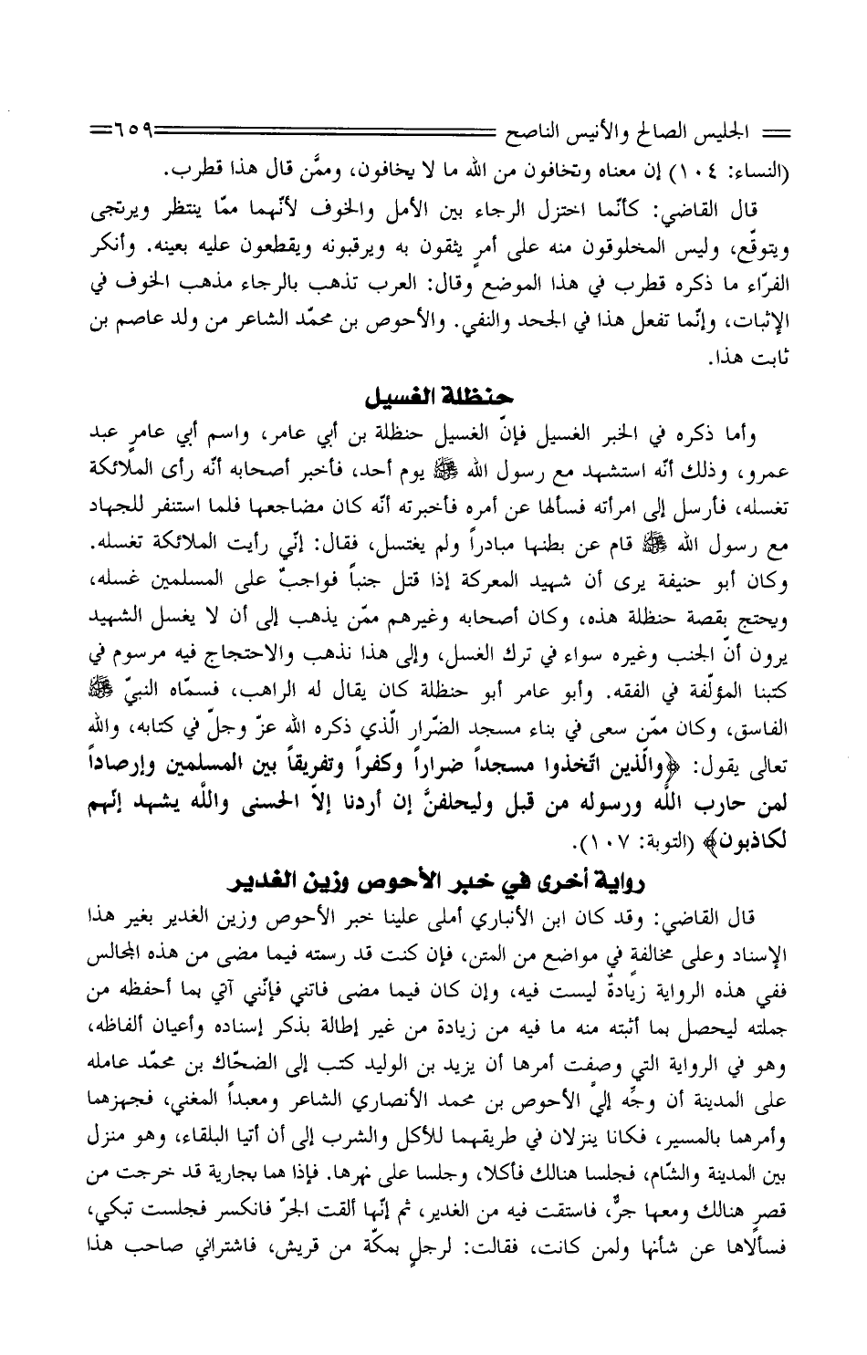 وأمّا ذكره فِي الْخَبَر الغسيل فَإِن الغسيل حَنْظَلَة بن أبي عَامِر، وَاسم أبي عامرٍ عبد عَمْرو، وَذَلِكَ أَنَّهُ اسْتشْهد مَعَ رَسُول اللَّهِ صَلَّى اللَّهُ عَلَيْهِ وَسَلَّمَ يَوْم أُحد، فَأخْبر أَصْحَابه أَنَّهُ رأى الْمَلَائِكَة تُغسله، فَأرْسل إِلَى امْرَأَته فَسَأَلَهَا عَن أمره فَأَخْبَرته أَنَّهُ كَانَ مضاجعها فَلَمَّا اسْتنْفرَ للْجِهَاد مَعَ رَسُول الله صَلَّى اللَّهُ عَلَيْهِ وَسَلَّمَ قَامَ عَن بَطنهَا مبادرًا وَلم يغْتَسل، فَقَالَ: إِنِّي رأيتُ الْمَلَائِكَة تغسله. وَكَانَ أَبُو حنيفَة يرى أَن شهيدَ المعركة إِذا قتل جُنبًا فواجبٌ على الْمُسلمين غسله، ويحتج بِقصَّة حَنْظَلَة هَذِه، وَكَانَ أَصْحَابه وَغَيرهم مِمَّن يذهب إِلَى أَن لَا يغسل الشَّهِيد يرونَ أَن الْجنب وَغَيره سَوَاء فِي ترك الْغسْل، وَإِلَى هَذَا نَذْهَب والاحتجاج فِيهِ مرسومٌ فِي كتبنَا الْمُؤَلّفَة فِي الْفِقْه. وَأَبُو عَامِر أَبُو حَنْظَلَة كَانَ يُقال لَهُ الراهب، فسمّاهُ النَّبيّ صَلَّى اللهُ عَلَيْهِ وَسَلَّمَ الْفَاسِق، وَكَانَ مِمَّن سعى فِي بِنَاء مَسْجِد الضرار الَّذِي ذكره الله عَزَّ وَجَلَّ فِي كِتَابه، وَالله تَعَالَى يَقُول: " والّذين اتّخذو مَسْجِدًا ضِرَارًا وَكُفْرًا وَتَفْرِيقًا بَيْنَ الْمُسلمين وَإِرْصَادًا لِمَنْ حَارَبَ اللَّه وَرَسُولَهُ مِنْ قَبْلُ وليحلفنَّ إِنْ أَرَدْنَا إِلا الْحُسْنَى واللَّه يَشْهَدُ إِنَّهُمْ لَكَاذِبُونَ " " التَّوْبَة: 107 ".