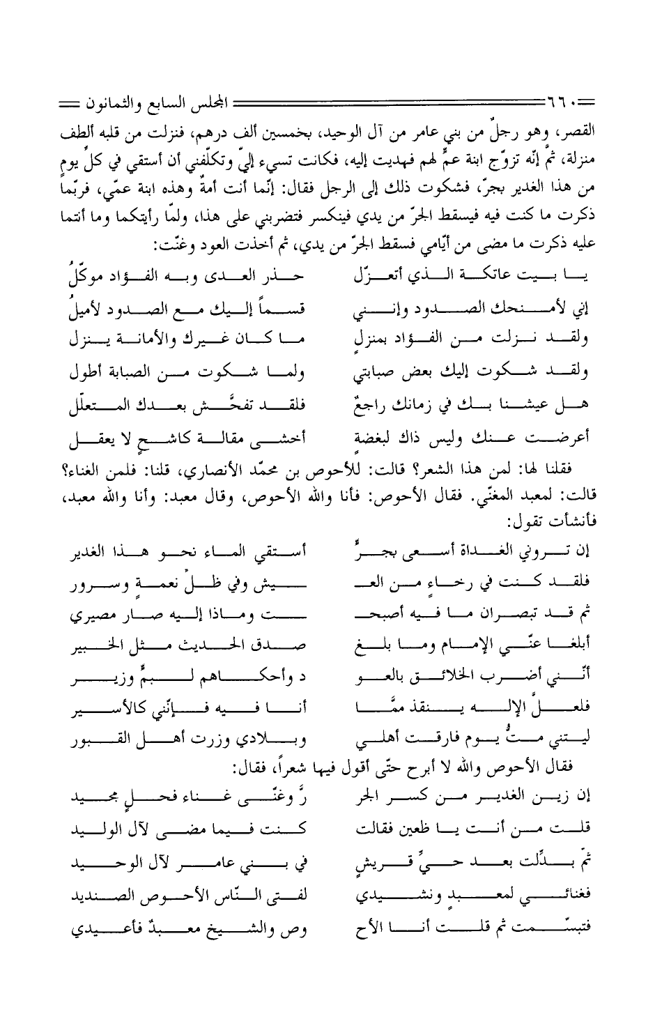 فَقُلْنَا لَهَا: لِمن هَذَا الشّعْر؟ قَالَت: للأحوص بن مُحَمَّد الأَنْصَارِيّ، قُلْنَا: فَلَمَّا الْغناء؟ قَالَت: لِمعبد المغنّي. فَقَالَ الْأَحْوَص: فَأَنا وَالله الْأَحْوَص، وَقَالَ معبد: وَأَنا وَالله معبد، فأنشأت تَقُولُ: