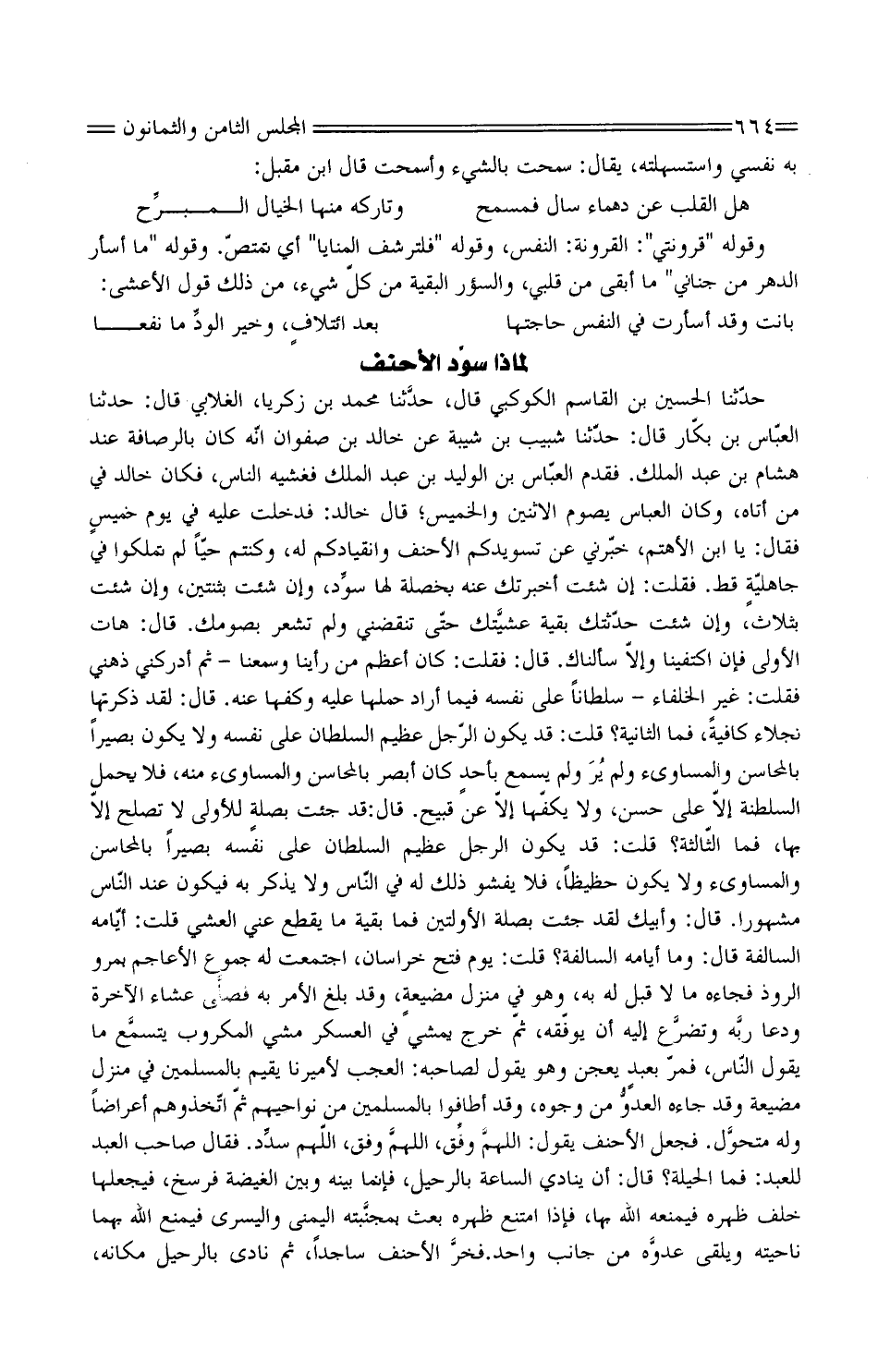 حَدَّثَنَا الْحُسَيْنُ بْنُ الْقَاسِمِ الْكَوْكَبِيُّ قَالَ، حدَّثنا مُحَمَّدُ بْنُ زَكَرِيَّا، الْغَلابِيُّ قَالَ: حَدَّثَنَا الْعَبَّاس بْن بكار قَالَ: حَدَّثَنَا شَبِيبُ بْنُ شَيْبَةَ عَنْ خَالِدِ بْنِ صَفْوَانَ أَنَّهُ كَانَ بِالرُّصَافَةِ عِنْدَ هِشَامِ بْنِ عَبْدِ الْمَلِكِ. فَقَدِمَ الْعَبَّاسُ بْنُ الْوَلِيدِ بْنِ عَبْدِ الْمَلِكِ فَغَشِيَهُ النَّاسُ، فَكَانَ خَالِدٌ فِي مَنْ أَتَاهُ، وَكَانَ الْعَبَّاسُ يَصُومُ الاثْنَيْنِ وَالْخَمِيسَ؛ قَالَ خَالِدٌ: فَدَخَلْتُ عَلَيْهِ فِي يَوْم خميسٍ فَقَالَ: يَا ابْن الأَهْتَمِ، خَبِّرْنِي عَنْ تَسْوِيدِكُمُ الأَحْنَفِ وَانْقِيَادِكُمْ لَهُ، وَكُنْتُمْ حَيًّا لَمْ تُمْلَكُوا فِي جاهليّةٍ قَطُّ. فَقُلْتُ: إِنْ شِئْتَ أَخْبَرْتُكَ عَنْهُ بِخَصْلَةٍ لَهَا سوِّد، وَإِنْ شِئْتَ بِثِنْتَيْنِ، وَإِنْ شِئْتَ بِثَلاثٍ، وَإِنْ شِئْتَ حدّثتك بَقِيَّة عشيَّتك حتّى تنقضني وَلَمْ تَشْعُرْ بِصَوْمِكَ. قَالَ: هَاتِ الأُولَى فَإِنِ اكْتَفَيْنَا وَإِلا سَأَلْنَاكَ. قَالَ: فَقُلْتُ: كَانَ أَعْظَمَ مَنْ رَأَيْنَا وَسَمِعْنَا - ثُمَّ أَدْرَكَنِي ذِهْنِي فَقُلْتُ: غَيْرَ الْخُلَفَاءِ - سُلْطَانًا عَلَى نَفْسِهِ فِيمَا أَرَادَ حَمْلَهَا عَلَيْهِ وكفهَّا عَنْهُ. قَالَ: لَقَدْ ذَكَرْتَهَا نَجْلاءَ كَافِيَةً، فَمَا الثَّانِيَةُ؟ قُلْتُ: قَدْ يَكُونُ الرَّجُلُ عَظِيمَ السُّلْطَانِ عَلَى نَفْسِهِ وَلا يَكُونُ بَصِيرًا بالمحاسن والمساوىء وَلَمْ يُرَ وَلَمْ يُسْمَعْ بأحدٍ كَانَ أبْصر بالمحاسن والمساوىء مِنْهُ، فَلا يَحْمِلُ السَّلْطَنَةَ إِلا عَلَى حَسَنٍ، وَلا يَكُفُّهَا إِلا عَنْ قَبِيحٍ. قَالَ: قَدْ جِئْتُ بصلةٍ للأُولَى لَا تَصْلُحُ إِلا بِهَا، فَمَا الثَّالِثَةُ؟ قُلْتُ: قَدْ يَكُونُ الرَّجُلُ عَظِيمَ السُّلْطَانِ عَلَى نَفسه بَصيرًا بالمحاسن والمساوىء وَلا يَكُونُ حَظِيظًا، فَلا يَفْشُو ذَلِكَ لَهُ فِي النَّاسِ وَلَا يُذْكَرُ بِهِ فَيَكُونُ عِنْدَ النَّاسِ مَشْهُورًا. قَالَ: وَأَبِيكَ لَقَدْ جِئْتَ بصلَة الأوليتن فَمَا بَقِيَّةُ مَا يَقْطَعُ عَنِّي الْعَشِيَّ قُلْتُ: أَيَّامُهُ السَّالِفَةُ قَالَ: وَمَا أَيَّامُهُ السَّالِفَةُ؟ قُلْتُ: يَوْمُ فَتْحِ خُرَاسَانَ، اجْتَمَعَتْ لَهُ جُمُوعُ الأَعَاجِمِ بِمَرْوِ الرُّوذِ فَجَاءَهُ مَا لَا قِبَلَ لَهُ بِهِ، وَهُوَ فِي مَنْزِلِ مضيعةٍ، وَقَدْ بَلَغَ الأَمْرُ بِهِ فصلَّى عِشَاءَ الآخِرَةِ وَدَعَا ربَّه وتضرَّع إِلَيْهِ أَنْ يُوَفِّقَهُ، ثُمَّ خَرَجَ يَمْشِي فِي الْعَسْكَرِ مَشْيَ الْمَكْرُوبِ يتسمَّع مَا يَقُولُ النَّاسُ، فَمَرَّ بعبدٍ يَعْجِنُ وَهُوَ يَقُولُ لِصَاحِبِهِ: الْعَجَبُ لأَمِيرِنَا يُقِيمُ بِالْمُسْلِمِينَ فِي مَنْزِلِ مَضِيعَةٍ وَقَدْ جَاءَهُ العدوُّ مِنْ وُجُوهٍ، وَقَدْ أَطَافُوا بِالْمُسْلِمِينَ مِنْ نَوَاحِيهِمْ ثمّ اتّخذوهم أعراضاً وَلَهُ متحوَّل. فَجَعَلَ الأَحْنَفُ يَقُولُ: اللهمَّ وفِّق، اللهمَّ وَفِّقْ، اللَّهُمَّ سدِّد. فَقَالَ صَاحِبُ الْعَبْدِ لِلْعَبْدِ: فَمَا الْحِيلَةُ؟ قَالَ: أَنْ يُنَادِيَ السَّاعَةَ بِالرَّحِيلِ، فَإِنَّمَا بَيْنَهُ وَبَيْنَ الْغَيْضَةِ فَرْسَخٌ، فَيَجْعَلَهَا خَلْفَ ظَهْرِهِ فَيَمْنَعَهُ اللَّهُ بِهَا، فَإِذَا امْتَنَعَ ظَهْرُهُ بَعَثَ بمجنَّبته الْيُمْنَى وَالْيُسْرَى فَيَمْنَعَ اللَّهُ بِهِمَا نَاحِيَتَهُ وَيَلْقَى عدوَّه مِنْ جَانِبٍ وَاحِدٍ. فخرَّ الأَحْنَفُ سَاجِدًا، ثُمَّ نَادَى بِالرَّحِيلِ مَكَانَهُ،
