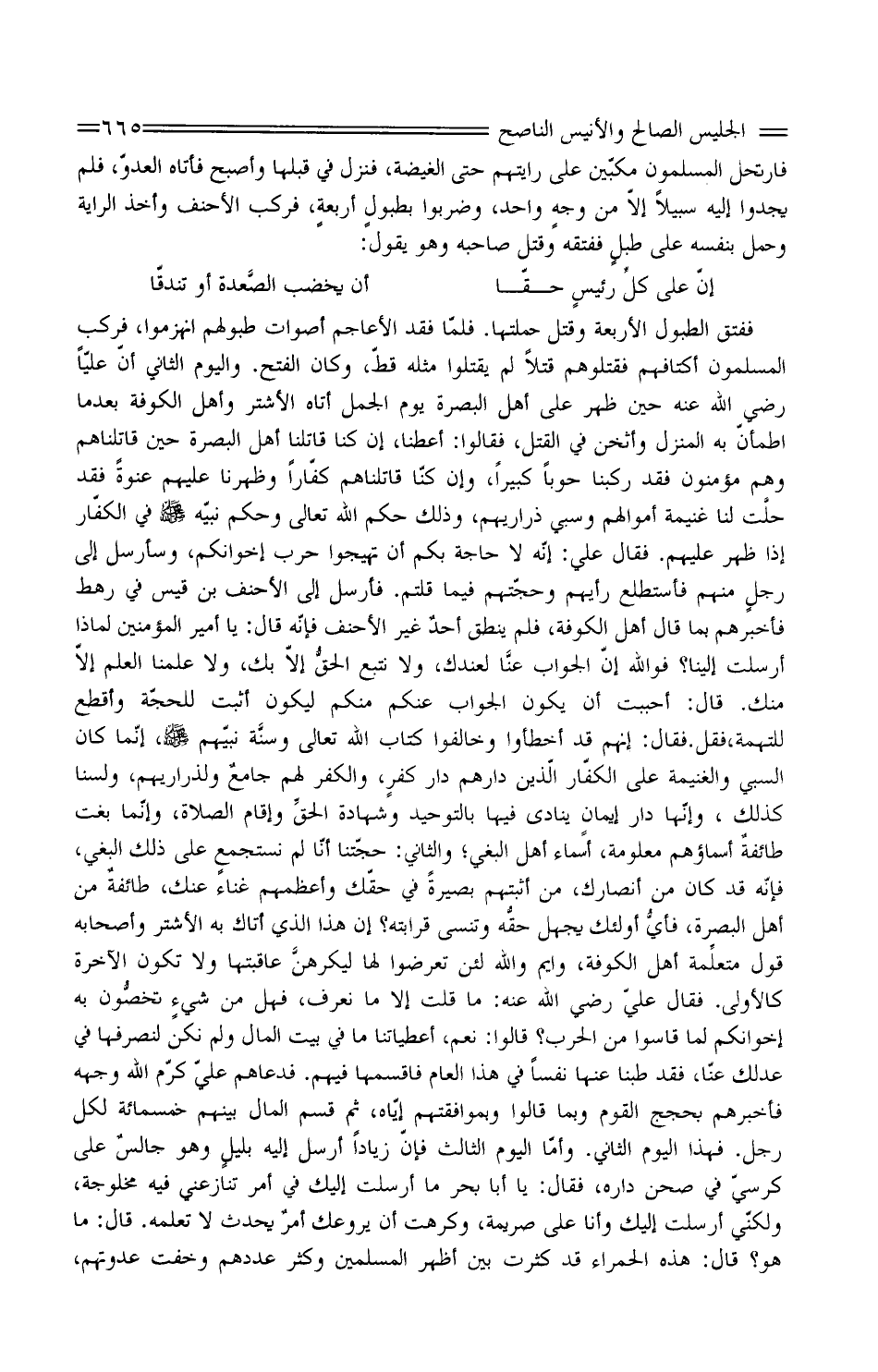 فَفَتَقَ الطُّبُولَ الأَرْبَعَةَ وَقَتَلَ حَمَلَتَهَا. فَلَمَّا فَقَدِ الأَعَاجِمُ أَصْوَاتَ طُبُولِهِمُ انْهَزَمُوا، فَرَكِبَ الْمُسْلِمُونَ أَكْتَافَهُمْ فَقَتَلُوهُمْ قَتْلا لَمْ يُقْتَلُوا مِثْلَهُ قَطُّ، وَكَانَ الْفَتْحُ. وَالْيَوْمُ الثَّانِي أَنَّ عَلِيًّا رَضِيَ اللَّهُ عَنْهُ حِينَ ظَهَرَ عَلَى أَهْلِ الْبَصْرَةِ يَوْمَ الْجَمَلِ أَتَاهُ الأَشْتَرُ وَأَهْلُ الْكُوفَةِ بَعْدَمَا اطْمَأَنَّ بِهِ الْمَنْزِلُ وَأَثْخَنَ فِي الْقَتْلِ، فَقَالُوا: أَعْطِنَا، إِنَّ كُنَّا قَاتَلْنَا أَهْلَ الْبَصْرَةِ حِينَ قَاتَلْنَاهُمْ وَهُمْ مُؤْمِنُونَ فَقَدْ رَكِبْنَا حُوبًا كَبِيرًا، وَإِنْ كُنَّا قَاتَلْنَاهُمْ كُفَّارًا وَظَهَرْنَا عَلَيْهِمْ عَنْوَةً فَقَدْ حلَّت لَنَا غَنِيمَةُ أَمْوَالِهِمْ وَسَبْيُ ذَرَارِيهِمْ، وَذَلِكَ حُكْمُ اللَّهِ تَعَالَى وَحُكْمُ نَبِيِّهِ صَلَّى اللهُ عَلَيْهِ وَسَلَّمَ فِي الْكُفَّارِ إِذَا ظُهِرَ عَلَيْهِمْ. فَقَالَ عَلِيٌّ: إِنَّهُ لَا حَاجَةَ بِكُمْ أَنْ تُهَيِّجُوا حَرْبَ إِخْوَانِكُمْ، وَسَأُرْسِلُ إِلَى رجلٍ مِنْهُمْ فَأَسْتَطْلِعَ رَأْيَهُمْ وَحُجَّتَهُمْ فِيمَا قُلْتُمْ. فَأَرْسَلَ إِلَى الأَحْنَفِ بْنِ قَيْسٍ فِي رَهْطٍ فَأَخْبَرَهُمْ بِمَا قَالَ أَهْلُ الْكُوفَةِ، فَلَمْ يَنْطِقْ أحدٌ غَيْرُ الأَحْنَفِ فَإِنَّهُ قَالَ: يَا أَمِيرَ الْمُؤْمِنِينَ لِمَاذَا أَرْسَلْتَ إِلَيْنَا؟ فَوَاللَّهِ إِنَّ الْجَوَابَ عنَّا لَعِنْدَكَ، وَلا نَتَّبِعُ الحقُّ إِلا بِكَ، وَلا عَلِمْنَا الْعِلْمَ إِلا مِنْكَ. قَالَ: أَحْبَبْتُ أَنْ يَكُونَ الْجَوَابُ عَنْكُمْ مِنْكُمْ لِيَكُونَ أَثْبَتَ لِلْحُجَّةِ وَأَقْطَعَ لِلتُّهْمَةِ، فَقل. فَقَالَ: إِنَّهُم قد أخطأوا وَخَالَفُوا كِتَابَ اللَّهِ تَعَالَى وسنَّة نَبِيِّهِمْ صَلَّى اللَّهُ عَلَيْهِ وَسَلَّمَ، إِنَّمَا كَانَ السَّبْيُ وَالْغَنِيمَةُ عَلَى الْكُفَّارِ الَّذِينَ دَارُهُمْ دَارُ كفرٍ، وَالْكُفْرُ لَهُمْ جامعٌ وَلِذَرَارِيهِمْ، وَلَسْنَا كَذَلِكَ، وَإِنَّهَا دَارُ إيمانٍ يُنَادَى فِيهَا بِالتَّوْحِيدِ وَشَهَادَةِ الحقِّ وَإِقَامِ الصَّلاةِ، وَإِنَّمَا بَغَتْ طائفةٌ أَسْمَاؤُهُمْ مَعْلُومَةٌ، أَسْمَاءُ أَهْلِ الْبَغْيِ؛ وَالثَّانِي: حُجَّتُنَا أَنَّا لَمْ نَسْتَجْمِعْ عَلَى ذَلِكَ الْبَغْيَ، فَإِنَّهُ قَدْ كَانَ مِنْ أَنْصَارِكَ، مِنْ أَثْبَتِهِمْ بَصِيرَةً فِي حَقِّكَ وَأَعْظَمِهِمْ غِنَاءً عَنْكَ، طائفةٌ مِنْ أَهْلِ الْبَصْرَةِ، فأيُّ أُولَئِكَ يُجْهَلُ حقُّه وَتُنْسَى قَرَابَتُهُ؟ إِنَّ هَذَا الَّذِي أَتَاكَ بِهِ الأَشْتَرُ وَأَصْحَابُهُ قَوْلَ متعلِّمة أَهْلِ الْكُوفَة، وَايْم وَالله لَئِنْ تَعَرَّضُوا لَهَا ليكرهنَّ عَاقِبَتَهَا وَلا تَكُونَ الآخِرَةُ كَالأُولَى. فَقَالَ عَلِيٌّ رَضِيَ اللَّهُ عَنْهُ: مَا قُلْتَ إِلا مَا نَعْرِفُ، فَهَلْ مِنْ شيءٍ تخصُّون بِهِ إِخْوَانَكُمْ لِمَا قَاسَوْا مِنَ الْحَرْبِ؟ قَالُوا: نعم، أعطياتنا مَا فِي بَيْتِ الْمَالِ وَلَمْ نَكُنْ لِنَصْرِفَهَا فِي عَدْلِكَ عَنَّا، فَقَدْ طِبْنَا عَنْهَا نَفْسًا فِي هَذَا الْعَامِ فَاقْسِمْهَا فِيهِمْ. فَدَعَاهُمْ عَلِيٌّ كَرَّمَ اللَّهُ وَجْهَهُ فَأَخْبَرَهُمْ بِحُجَجِ الْقَوْمِ وَبِمَا قَالُوا وَبِمَوَافَقَتِهِمْ إِيَّاهُ، ثُمَّ قَسَمَ الْمَالَ بَيْنَهُمْ خَمْسمِائَة لِكُلِّ رَجُلٍ. فَهَذَا الْيَوْمُ الثَّانِي. وَأَمَّا الْيَوْمُ الثَّالِثُ فَإِنَّ زِيَادًا أَرْسَلَ إِلَيْهِ بليلٍ وَهُوَ جالسٌ عَلَى كُرْسِيٍّ فِي صَحْنِ دَارِهِ، فَقَالَ: يَا أَبَا بَحْرٍ مَا أَرْسَلْتُ إِلَيْكَ فِي أَمْرٍ تُنَازِعُنِي فِيهِ مَخْلُوجَةٌ، وَلَكِنِّي أَرْسَلْتُ إِلَيْكَ وَأَنَا عَلَى صَرِيمَةٍ، وَكَرِهْتُ أَنْ يُرَو