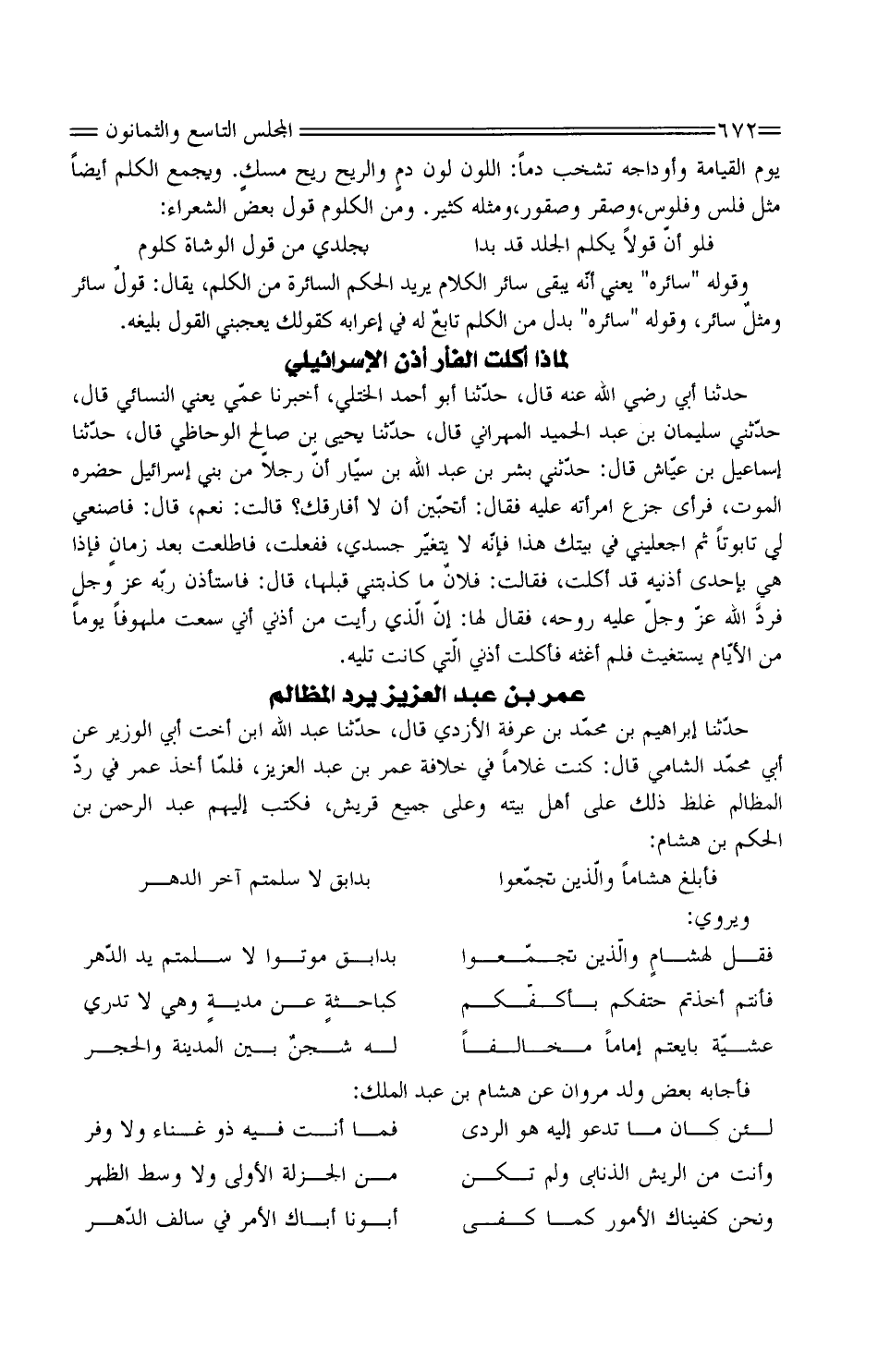 حَدَّثَنَا إِبْرَاهِيم بْن مُحَمَّد بْن عَرَفَة الأَزْدِيّ قَالَ، حدّثنا عبد الله ابْنِ أُخْتِ أَبِي الْوَزِيرِ عَنِ أبي مُحَمَّد الشَّامي قَالَ: كنتُ غُلَاما فِي خلَافَة عمر بن عبد الْعَزِيز، فلمَّا أَخذ عمر فِي ردّ المظالِم غلظ ذَلِكَ على أهل بَيته وعَلى جَميع قُرَيْش، فَكتب إِلَيْهِم عبد الرَّحْمَن بن الحكم بن هِشَام: