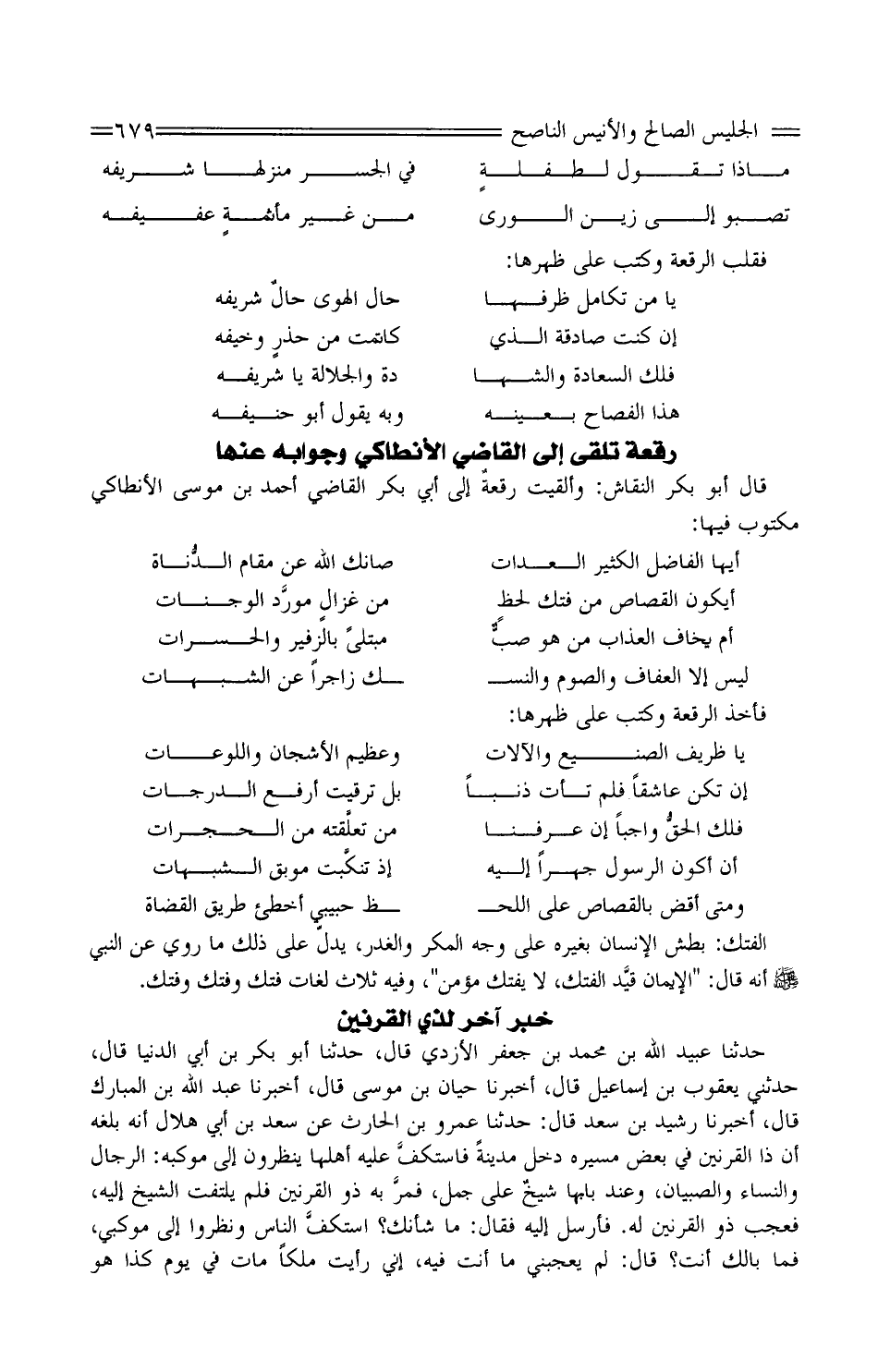 حَدَّثَنَا عُبَيْد الله بن مُحَمَّد بْن جَعْفَر الأَزْدِيّ قَالَ، حَدَّثَنَا أَبُو بَكْر بْن أبي الدُّنْيَا قَالَ، حَدَّثَنِي يَعْقُوب بن إِسْمَاعِيل قَالَ، أَخْبَرَنَا حَيَّان بن مُوسَى قَالَ، أَخْبَرَنَا عبد الله بن الْمُبَارك قَالَ، أَخْبَرَنَا رشيد بن سعد قَالَ: حَدَّثَنَا عَمْرو بن الْحَارِث عَن سعد بن أبي هِلَال أَنَّهُ بلغه أَن ذَا القرنين فِي بعض مسيره دخل مَدِينَة فاستكفَّ عَلَيْهِ أَهلهَا ينظرونَ إِلَى موكبه: الرِّجَال وَالنِّسَاء وَالصبيان، وَعند بَابهَا شيخٌ على جمل، فمرَّ بِهِ ذُو القرنين فَلم يلْتَفت الشَّيْخ إِلَيْهِ، فَعجب ذُو القرنين لَهُ. فأرسلَ إِلَيْهِ فَقَالَ: مَا شَأْنك؟ استكفَّ الناسُ ونظروا إِلَى موكبي، فَمَا بالك أَنْت؟ قَالَ: لم يُعجبنِي مَا أَنْت فِيهِ، إِنِّي رأيتُ ملكا مَاتَ فِي يَوْم كَذَا هُوَ