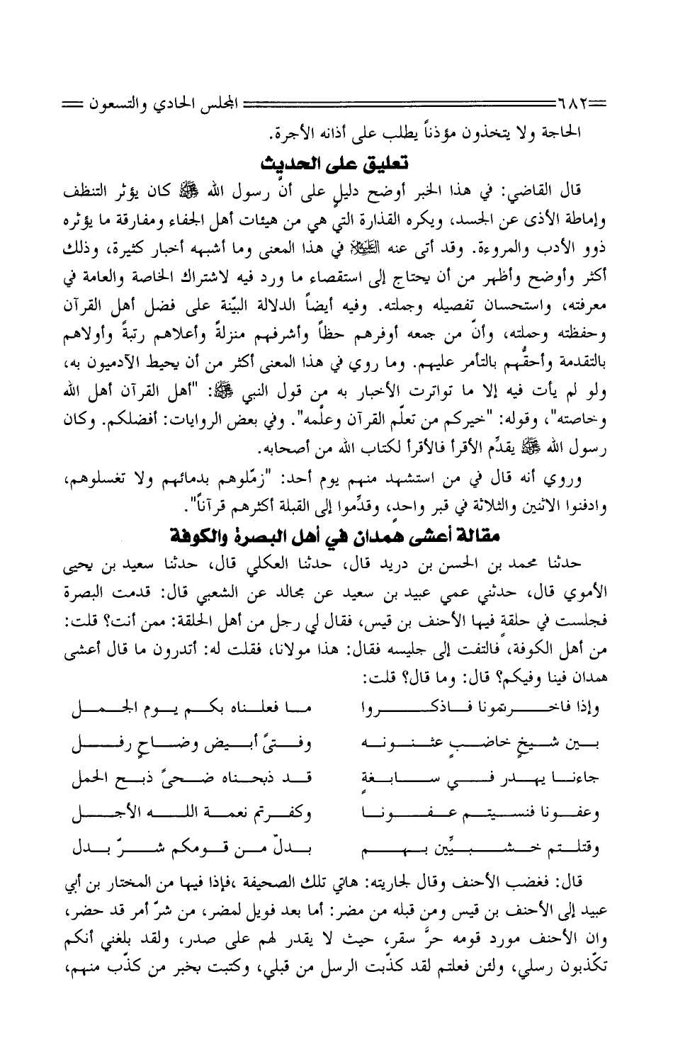 حَدَّثَنَا مُحَمَّد بن الْحَسَن بْن دُرَيْد قَالَ، حَدَّثَنَا العكلي قَالَ، حَدَّثَنَا سعيد بن يحيى الْأمَوِي قَالَ، حَدَّثَنِي عمي عُبَيْد بن سعيد عَن مجَالد عَن الشّعبِيّ قَالَ: قدمتُ الْبَصْرَة فجلستُ فِي حلقةٍ فِيهَا الْأَحْنَف بن قيس، فَقَالَ لي رجلٌ من أهل الْحلقَة: مِمَّن أَنْت؟ قلت: من أهل الْكُوفَة، فالتفتَ إِلَى جليسه فَقَالَ: هَذَا مَوْلَانَا، فقلتُ لَهُ: أتدرونَ مَا قَالَ أعشى هَمدَان فِينَا وَفِيكُمْ؟ قَالَ: وَمَا قَالَ؟ قلت: