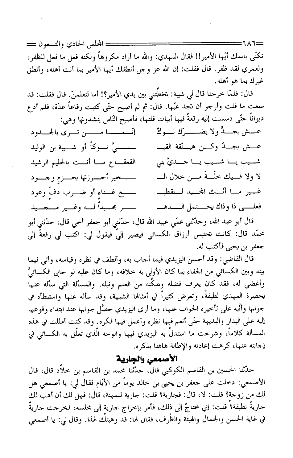 حَدَّثَنَا الْحُسَيْنُ بْنُ الْقَاسِمِ الْكَوْكَبِيُّ قَالَ، حَدَّثَنَا مُحَمَّد بْن القَاسِم بْن خَلاد قَالَ، قَالَ الْأَصْمَعِي: دخلت عَلَى جَعْفَر بْن يَحْيَى بْن خَالِد يَوْمًا من الأيَّام فَقَالَ لي: يَا أصمعي هَلْ لَك من زوجةٍ؟ قُلْتُ: لَا، قَالَ: فجارية؟ قُلْتُ: جاريةٌ للمِهْنة، قَالَ: فَهَل لَك أَن أهبَ لَك جَارِيَة نظيفة؟ قُلْتُ: إِنِّي لمحتاجٌ إِلَى ذَلِكَ، فَأمر بِإِخْرَاج جاريةٍ إِلَى مَجْلِسه، فخرجتُ جاريةٌ فِي غَايَة الْحَسَن وَالْجمال والهيئة والظَّرف، فَقَالَ لَهَا: قَدْ وهبتُكِ لهَذَا. وَقَالَ لي: يَا أصمعي
