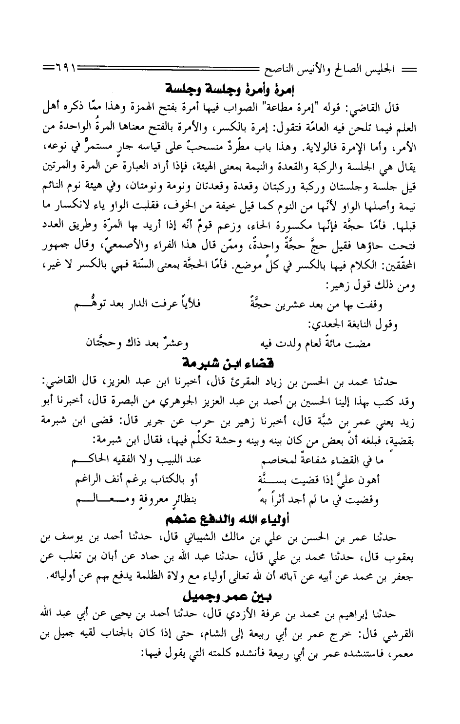 حَدَّثَنَا مُحَمَّد بن الْحسن بن زِيَاد الْمُقْرِئ قَالَ، أَخْبَرَنَا ابْن عبد الْعَزِيز، قَالَ القَاضِي: وَقد كتب بِهذا إِلَيْنَا الْحُسَيْن بن أَحْمَد بن عبد الْعَزِيز الْجَوْهَرِي من الْبَصْرَة قَالَ، أَخْبَرَنَا أَبُو زَيْدٍ يَعْنِي عُمَرَ بْنَ شبَّة قَالَ، أَخْبَرَنَا زُهَيْر بن حَرْب عَن جرير قَالَ: قضى ابْن شبْرمَة بقضيةٍ، فَبَلغهُ أنَّ بعض من كَانَ بَينه وَبَينه وَحْشَة تكلَّم فِيها، فَقَالَ ابْن شبْرمَة: