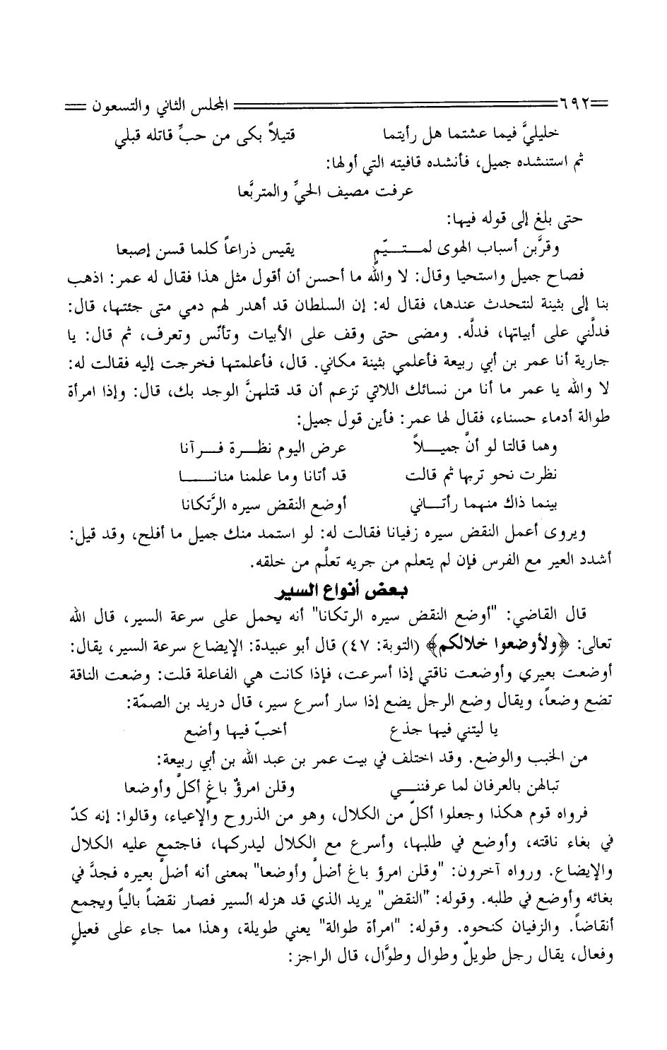 قَالَ القَاضِي: " أوضعُ النقضَ سيرَهُ الرتكانا " أَنَّهُ يحمل على سرعَة السّير، قَالَ الله تَعَالَى: " وَلأَوْضَعُوا خِلالَكُمْ " " التَّوْبَة:47 " قَالَ أَبُو عُبَيْدَة: الإيضاعُ سرعَة السّير، يُقالُ: أوضعتُ بَعِيري وأوضعتُ نَاقَتي إِذا أسرعت، فَإِذا كَانَت هِيَ الفاعلة قلت: وضعت النَّاقة تضعُ وضعا، ويُقال وضع الرجلُ يضعُ إِذا سَار أسْرع سير، قَالَ دُرَيْد بْن الصمَّة: