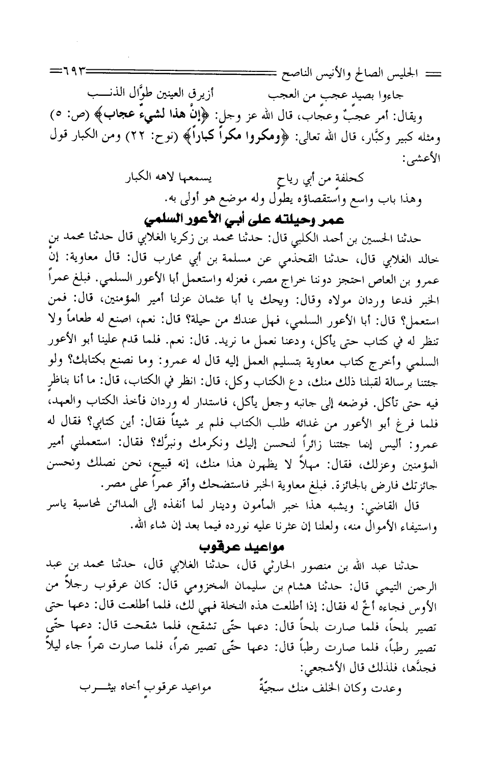 حَدَّثَنَا الْحُسَيْن بْن أَحْمَد الْكَلْبِيّ قَالَ: حَدَّثَنَا مُحَمَّد بْن زَكَرِيّا الْغلابِي قَالَ، حَدَّثَنَا مُحَمَّد بْن خَالِدٍ الْغَلابِيُّ قَالَ، حَدَّثَنَا الْقَحْذَمِيُّ عَنْ مَسْلَمَةَ بْنِ أَبِي مُحَارِبٍ قَالَ: قَالَ مُعَاوِيَةُ: إنَّ عَمْرَو بْنَ الْعَاصِ احْتَجَزَ دُونَنَا خَرَاجَ مِصْرَ، فَعَزَلَهُ وَاسْتَعْمَلَ أَبَا الأَعْوَرِ السُّلَمِيَّ. فَبَلَغَ عَمْرًا الْخَبَرُ فَدَعَا وَرْدَانَ مَوْلاهُ وَقَالَ: وَيْحَكَ يَا أَبَا عُثْمَانَ عَزَلَنَا أَمِيرُ الْمُؤْمِنِينَ، قَالَ: فَمَنِ اسْتَعْمَلَ؟ قَالَ: أَبَا الأَعْوَرِ السُّلَمِيَّ، فَهَلْ عِنْدَكَ مِنْ حِيلَةٍ؟ قَالَ: نَعَمْ، اصْنَعْ لَهُ طَعَامًا وَلا تَنْظُرْ لَهُ فِي كِتَابٍ حَتَّى يَأْكُلَ، وَدَعْنَا نَعْمَلُ مَا نُرِيدُ. قَالَ: نَعَمْ. فَلَمَّا قَدِمَ عَلَيْنَا أَبُو الأَعْوَرِ السُّلَمِيُّ وَأَخْرَجَ كِتَابَ مُعَاوِيَةَ بِتَسْلِيمِ الْعَمَلِ إِلَيْهِ قَالَ لَهُ عَمْرٌو: وَمَا نصْنَع بكتابك؟ وَلَو جِئْتَنَا بِرِسَالَةٍ لَقَبِلْنَا ذَلِكَ مِنْكَ، دَعِ الْكِتَابَ وَكُلْ، قَالَ: انْظُرْ فِي الْكِتَابِ، قَالَ: مَا أَنَا بناظرٍ فِيهِ حَتَّى تَأْكُلَ. فَوَضَعَهُ إِلَى جَانِبِهِ وَجَعَلَ يَأْكُلُ، فَاسْتَدَارَ لَهُ وَرْدَانُ فَأَخَذَ الْكِتَابَ وَالْعَهْدَ، فَلَمَّا فَرَغَ أَبُو الأَعْوَرِ مِنْ غَدَائِهِ طَلَبَ الْكِتَابَ فَلَمْ يَرَ شَيْئًا فَقَالَ: أَيْنَ كِتَابِي؟ فَقَالَ لَهُ عَمْرٌو: أَلَيْسَ إِنَّمَا جِئْتَنَا زَائِرًا لِنُحْسِنَ إِلَيْكَ وَنُكْرِمَكَ ونبرَّك؟ فَقَالَ: اسْتَعْمَلَنِي أَمِيرُ الْمُؤْمِنِينَ وَعَزَلَكَ، فَقَالَ: مَهْلا لَا يَظْهَرَنْ هَذَا مِنْكَ، إِنَّهُ قَبِيحٌ، نَحْنُ نَصِلُكَ وَنُحْسِنُ جَائِزَتَكَ فَارْضَ بِالْجَائِزَةِ. فَبَلَّغَ مُعَاوِيَةَ الْخَبَرَ فَاسْتَضْحَكَ وَأَقَرَّ عَمْرًا عَلَى مِصْرَ.