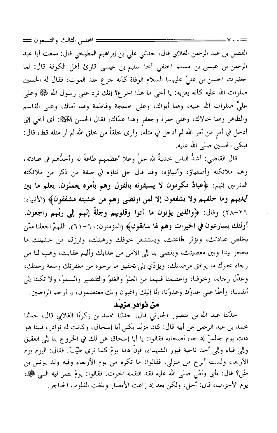 الْفَضْلِ بْنِ عَبْدِ الرَّحْمَنِ الْغَلابِيُّ قَالَ، حَدَّثَنِي عَلِيّ بْن إِبْرَاهِيم الْمَطْبَخِيُّ قَالَ: سَمِعْتُ أَبَا عَبْدِ الرَّحْمَنِ بْنَ عِيسَى بْنِ مُسْلِمٍ الْحَنَفِيَّ أَخَا سُلَيْمِ بْنِ عِيسَى قَارِئِ أَهْلِ الْكُوفَةِ قَالَ: لَمَّا حَضَرَتِ الْحَسَنَ بْنَ عَلِيٍّ عَلَيْهِمَا السَّلامُ الْوَفَاةُ كَأَنَّهُ جَزِعَ عِنْدَ الْمَوْتِ، فَقَالَ لَهُ الْحُسَيْنُ صَلَوَاتُ اللَّهِ عَلَيْهِ كَأَنَّهُ يُعَزِّيهِ: يَا أَخِي مَا هَذَا الْجَزَعُ؟ إِنَّكَ تَرِدُ عَلَى رَسُولِ اللَّهِ صَلَّى اللَّهُ عَلَيْهِ وَسَلَّمَ وَعَلَى عليٍّ صَلَوَاتُ اللَّهِ عَلَيْهِ، وَهُمَا أَبَوَاكَ، وَعَلَى خَدِيجَةَ وَفَاطِمَةَ وَهُمَا أُمَّاكَ، وَعَلَى الْقَاسِمِ وَالطَّاهِرِ وَهُمَا خَالاكَ، وَعَلَى حَمْزَةَ وجعفرٍ وَهُمَا عَمَّاكَ، فَقَالَ الْحَسَنُ عَلَيْهِ السَّلامُ: أَيْ أَخِي إِنِّي أَدْخُلُ فِي أمرٍ مِنْ أَمْرِ اللَّهِ لَمْ أَدْخُلْ فِي مِثْلِهِ، وَأَرَى خَلْقًا مِنْ خَلْقِ اللَّهِ لَمْ أَرَ مِثْلَهُ قَطُّ، قَالَ: فَبَكَى الْحُسَيْنُ صَلَّى اللَّهُ عَلَيْهِ.