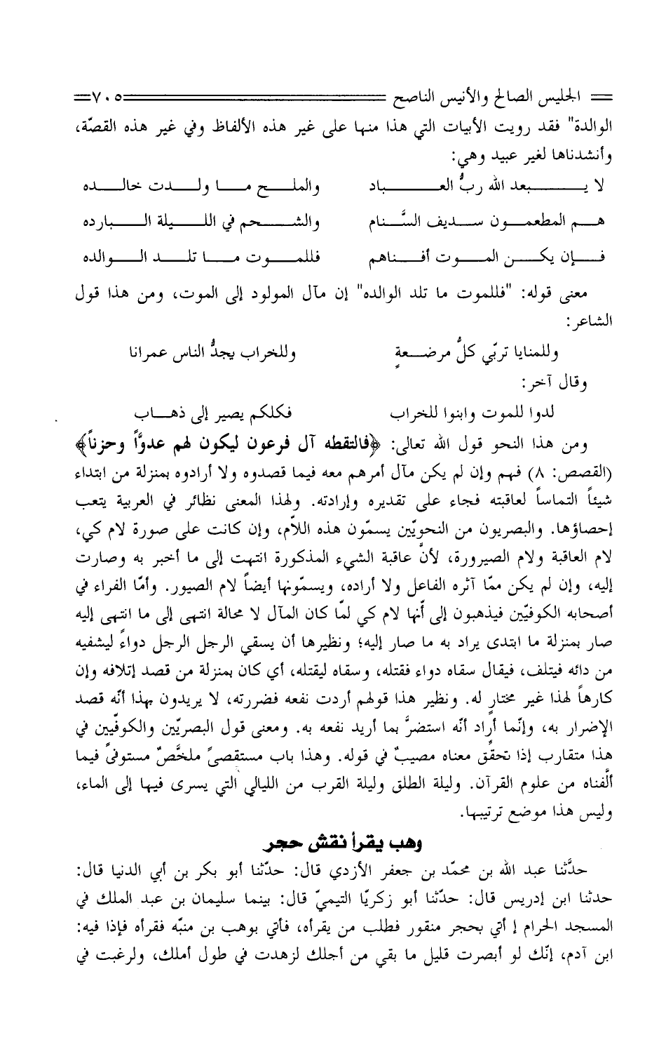 وَمن هَذَا النَّحْو قَول الله تَعَالَى: " فَالْتَقَطَهُ آلُ فِرْعَوْنَ لِيَكُونَ لَهُمْ عدوَّاً وَحَزَنًا " الْقَصَص:8 " فهم وَإِن لَمْ يكن مآل أَمرهم مَعَه فِيمَا قصدوه وَلَا أرادوه بِمنزلة من ابْتِدَاء شَيْئا التماسًا لعاقبته فجَاء على تَقْدِيره وإرادته. ولِهذا الْمَعْنى نَظَائِر فِي الْعَرَبيَّة يُتْعِبُ إحصاؤها. والبصريون من النَّحْوِيين يسمون هَذِه اللَّام، وَإِن كَانَت على صُورَة لَام كي، لامَ الْعَاقِبَة ولامَ الصيرورة، لأنَّ عَاقِبَة الشَّيْء الْمَذْكُورَة انْتَهَت إِلَى مَا أخبر بِهِ وَصَارَت إِلَيْهِ، وَإِن لَمْ يكن مِمّا آثره الْفَاعِل وَلَا أَرَادَهُ، ويسمونها أَيْضا لَام الصيور. وأمّا الفراءُ فِي أَصْحَابه الْكُوفِيّين فيذهبونَ إِلَى أنَّها لامُ كي لمّا كَانَ المآلُ لَا محَالة انْتهى إِلَى مَا انْتهى إِلَيْهِ صَار بِمنزلة مَا ابتدى يُراد بِهِ مَا صَار إِلَيْهِ؛ ونظيرها أَن يسْقِي الرجل الرجل دَوَاء ليشفيه من دائه فيتلف، فَيُقَال سقَاهُ دَوَاء فَقتله، وسقاه ليَقْتُلهُ، أَي كَانَ بِمنزلة من قصد إِتْلَافه وَإِن كَارِهًا لِهذا غيرَ مختارٍ لَهُ. وَنَظِير هَذَا قَوْلهم أردْت نَفعه فضررته، لَا يريدونَ بِهذا أَنَّهُ قصد الْإِضْرَار بِهِ، وإنَّما أَرَادَ أَنَّهُ استضرَّ بِما أريدَ نَفعه بِهِ. وَمعنى قَول الْبَصرِيين والكوفيين فِي هَذَا مُتَقَارب إِذا تحقِّق معناهُ مصيبٌ فِي قَوْله. وَهَذَا بَاب مستقصى ملخَّصٌ مُسْتَوفى فِيمَا ألَّفناه من عُلُوم الْقُرْآن. وَلَيْلَة الطَلَقِ وَلَيْلَة القَرَبِ من اللَّيَالِي الَّتِي يُسْرَى فِيهَا إِلَى المَاء، وَلَيْسَ هَذَا موضعَ ترتيبها.
