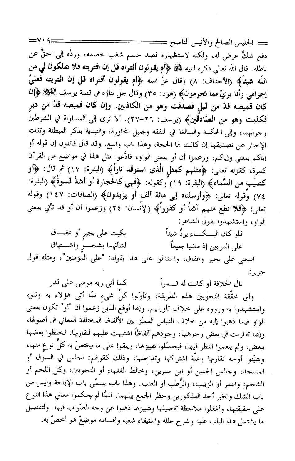 وأبى مُحَقّقَةُ النَّحْوِيين هَذِه الطريقةَ، وتأوّلوا كلَّ شيءٍ مِمّا أَتَى هَؤُلاءِ بِهِ وتلوه واستشهدوا بِهِ وَرَوَوْهُ على خلاف تأويلهم. وإنَّما أوقعَ الَّذِينَ زَعَمُوا أَن " أَو " تكون بِمعنى الْوَاو فِيمَا ذَهَبُوا إِلَيْهِ من خلاف الْقيَاس الْمُمَيز بَين الْأَلْفَاظ الْمُخْتَلفَة الْمعَانِي فِي أُصُولهَا، وَإِنَّا تقاربت فِي بعض وجوهها، وجودُهم ألفاظًا اشتبهت عَلَيْهِم لتقاربها، فخلطوا بَعْضهَا بِبَعْض، وَلم ينعموا النّظر فِيهَا، فيحصّلوا تمييزها، ويقوا على مَا يختصّ بِهِ كلُّ نوعٍ مِنْهَا، ويتبّينوا أَوْجُهَ تقاربها وعلَّةَ اشتراكِها وتداخلها، وَذَلِكَ كقولِهم: اجْلِسْ فِي السوقِ أَو الْمَسْجِد، وجالس الْحَسَن أَو ابْن سِيرِين، وخالطَ الفقهاءَ أَو النَّحْوِيين، وكلِ اللَّحْم أَو الشَّحْم، وَالتَّمْر أَو الزَّبِيب، والرُّطب أَو العنبَ. وَهَذَا بابٌ يُسَمَّى بَاب الْإِبَاحَة وَلَيْسَ من بَاب الشَّك وتَخير أحد الْمَذْكُورين وحظر الْجمع بَينهمَا. فلمَّا لَمْ يُحْكِمُوا معانيَ هَذَا النَّوْع على حَقِيقَتهَا، وأغفلوا ملاحظةَ تفصيلها وتَمييزها ذَهَبُوا عَن وَجه الصَّوَاب فِيهَا. ولتفصيل مَا يشْتَمل هاذ الْبَاب عَلَيْهِ وَشرح علله وَاسْتِيفَاء شعبه وأقسامه موضعٌ هُوَ أخصّ بِهِ.