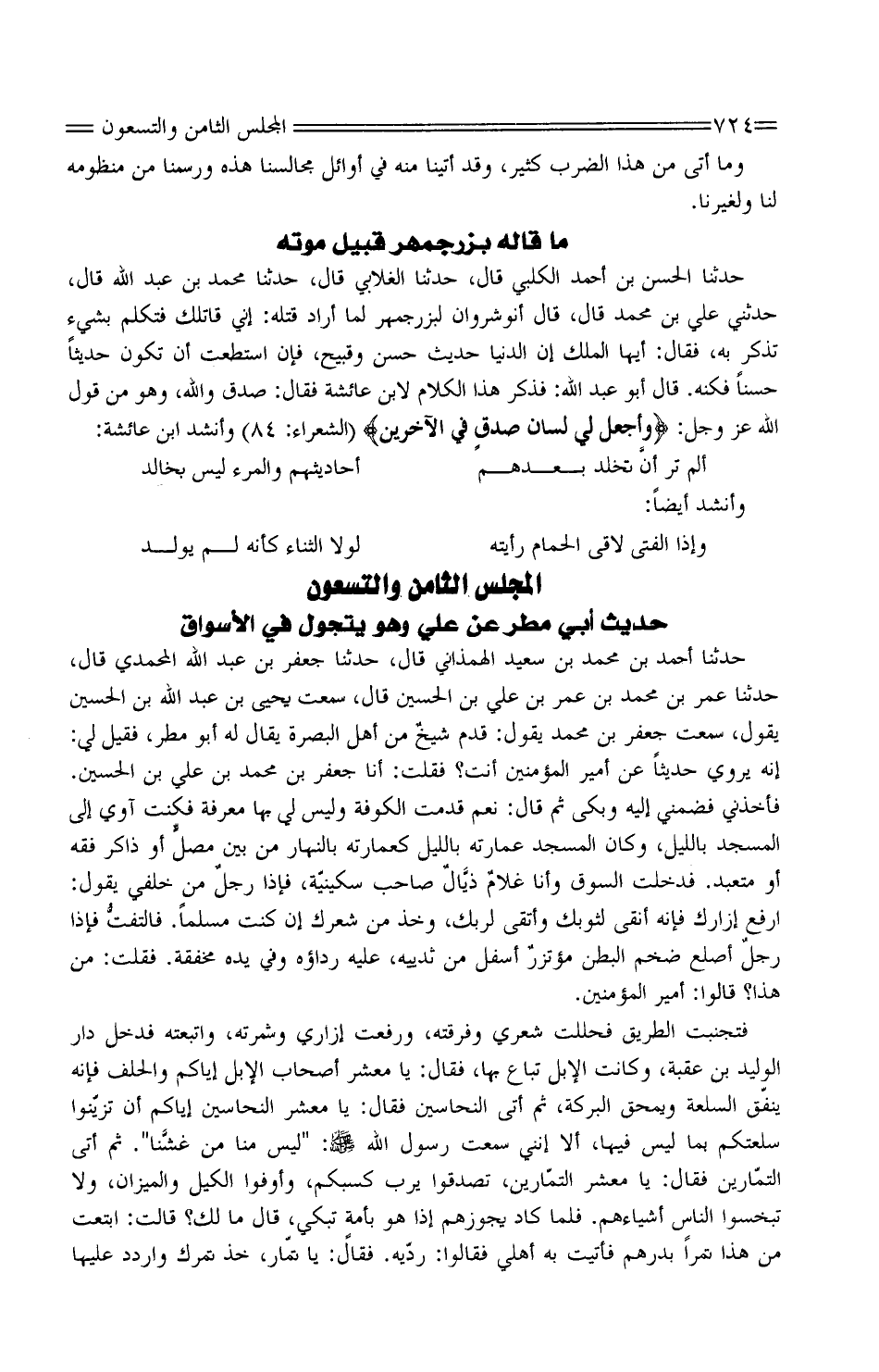 حَدَّثَنَا الْحَسَن بْن أَحْمَد الْكَلْبِيّ قَالَ، حَدَّثَنَا الْغلابِي قَالَ، حَدَّثَنَا مُحَمَّد بْن عبد الله قَالَ، حَدَّثَنِي عَليّ بن مُحَمَّد قَالَ، قَالَ أنو شرْوَان لبزرجمهر لَما أَرَادَ قَتله: إِنِّي قاتِلُكَ فَتكلم بِشَيْء تُذْكَرُ بِهِ، فَقَالَ: أيُّها الْملك إِن الدُّنْيَا حَدِيث حسن وقبيح، فَإِن استطعتَ أَن تكونَ حَدِيثا حسنا فَكُنْهُ. قَالَ أَبُو عبد الله: فَذكر هَذَا الْكَلَام لِابْنِ عَائِشَة فَقَالَ: صَدَقَ وَالله، وَهُوَ من قَول الله عَزَّ وَجَلَّ: " وَاجْعَلْ لِي لِسَانَ صدقٍ فِي الآخِرِينَ " " الشُّعَرَاء: 84 " وَأنْشد ابْن عَائِشَة: