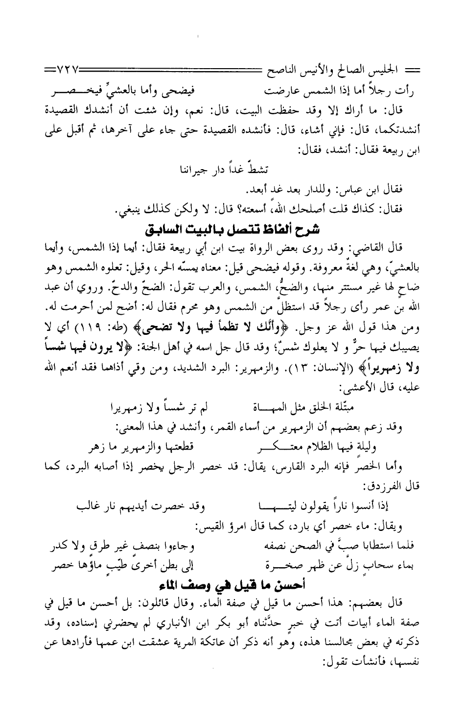قَالَ بَعضهم: هَذَا أحسنُ مَا قيل فِي صفة المَاء. وَقَالَ قَائِلُونَ: بَلْ أحسنُ مَا قيل فِي صفة المَاء أبياتٌ أتتْ فِي خبرٍ حدَّثناه أَبُو بكر ابْن الأَنْبَارِيّ لَمْ يَحْضرْني إسنادُهُ، وَقد ذكرتُهُ فِي بعض مجالسنا هَذِه، وَهُوَ أَنَّهُ ذكر أَن عاتكةَ المرية عَشِقَتِ ابْن عمّها فأرادها عَن نَفسهَا، فأنشأت تَقُولُ: