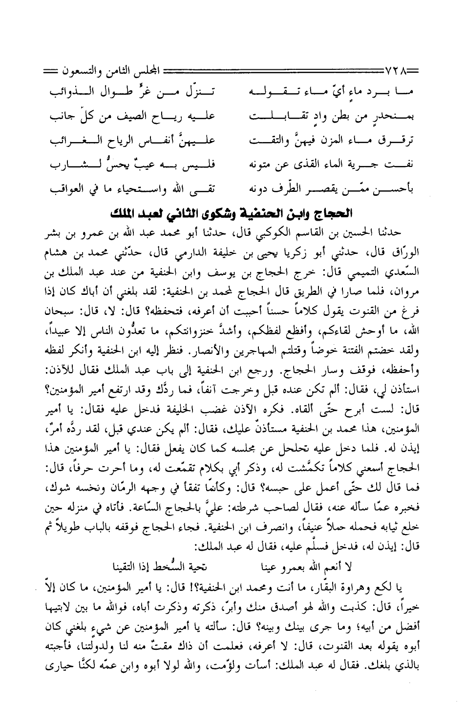 حَدَّثَنَا الْحُسَيْنُ بْنُ الْقَاسِمِ الْكَوْكَبِيُّ قَالَ، حَدَّثَنَا أَبُو مُحَمَّد عَبْد اللَّه بْن عَمْرو بْن بشر الْوَرَّاقُ قَالَ، حَدَّثَنِي أَبُو زَكَرِيَّا يَحْيَى بْنُ خَلِيفَةَ الدَّارِمِيُّ قَالَ، حَدَّثَنِي مُحَمَّدُ بْنُ هِشَامٍ السَّعْدِيُّ التَّمِيمِيُّ قَالَ: خَرَجَ الْحَجَّاجُ بْنُ يُوسُفَ وَابْنُ الْحَنَفِيَّةِ مِنْ عِنْدِ عَبْدِ الْمَلِكِ بْنِ مَرْوَانَ، فَلَمَّا صَارَا فِي الطَّرِيقِ قَالَ الْحَجَّاجُ لِمُحَمَّدِ بْنِ الْحَنَفِيَّةِ: لَقَدْ بَلَغَنِي أَن اباك كَانَ إِ ذَا فَرَغَ مِنَ الْقُنُوتِ يَقُولُ كَلامًا حَسَنًا أَحْبَبْتُ أَنْ أَعْرِفَهُ، فَتَحْفَظُهُ؟ قَالَ: لَا، قَالَ: سُبْحَانَ اللَّهِ، مَا أَوْحَشَ لِقَاءَكُمْ، وَأَفْظَعَ لَفْظَكُمْ، وأشدَّ خُنْزُوَانَتَكُمْ، مَا تعدُّون النَّاسَ إِلا عَبِيدًا، وَلَقَدْ خُضْتُمُ الْفِتْنَةَ خوضاً وقتلتم الْمُهَاجِرين والنصار. فَنَظَرَ إِلَيْهِ ابْنُ الْحَنَفِيَّةِ وَأَنْكَرَ لَفْظَهُ وَأَحْفَظَهُ، فَوَقَفَ وَسَارَ الْحَجَّاجُ. وَرَجَعَ ابْنُ الْحَنَفِيَّةِ إِلَى بَابِ عَبْدِ الْمَلِكِ فَقَالَ لِلآذِنِ: اسْتَأْذِنْ لِي، فَقَالَ: أَلَمْ تَكُنْ عِنْدَهُ قَبْلُ وَخَرَجْتَ آنِفًا، فَمَا ردَّك وَقَدِ ارْتَفَعَ أَمِيرُ الْمُؤْمِنِينَ؟ قَالَ: لَسْتُ أَبْرَحُ حَتَّى أَلْقَاهُ. فَكَرِهَ الآذان غَضَبَ الْخَلِيفَةِ فَدَخَلَ عَلَيْهِ فَقَالَ: يَا أَمِيرَ الْمُؤْمِنِينَ، هَذَا مُحَمَّدُ بْنُ الْحَنَفِيَّةِ مستأذنٌ عَلَيْكَ، فَقَالَ: أَلَمْ يَكُنْ عِنْدِي قَبْلُ، لَقَدْ ردَّه أمرٌ، إِيذَنْ لَهُ. فَلَمَّا دَخَلَ عَلَيْهِ تَحَلْحَلَ عَنْ مَجْلِسِهِ كَمَا كَانَ يَفْعَلُ فَقَالَ: يَا أَمِيرَ الْمُؤْمِنِينَ هَذَا الْحَجَّاجُ أَسْمَعَنِي كَلامًا تكمَّشت لَهُ، وَذَكَرَ أَبِي بِكَلامٍ تَقَمَّعْتُ لَهُ، وَمَا أَحَرْتُ حَرْفًا، قَالَ: فَمَا قَالَ لَكَ حَتَّى أَعْمَلَ عَلَى حَبْسِهِ؟ قَالَ: وَكَأَنَّمَا تَفَقَّأَ فِي وَجْهِهِ الرُّمَّانُ وَنَخَسَهُ شَوْكٌ، فَخَبَّرَهُ عَمَّا سَأَلَهُ عَنْهُ، فَقَالَ لِصَاحِبِ شُرْطَتِهِ: عليَّ بِالْحَجَّاجِ السَّاعَةَ. فَأَتَاهُ فِي مَنْزِلِهِ حِينَ خَلَعَ ثِيَابَهُ فَحَمَلَهُ حَمْلا عَنِيفًا، وَانْصَرَفَ ابْنُ الْحَنَفِيَّةِ. فَجَاءَ الْحَجَّاجُ فَوَقَفَهُ بِالْبَابِ طَوِيلا ثُمَّ قَالَ: إِيذَنْ لَهُ، فَدَخَلَ فسلَّم عَلَيْهِ، فَقَالَ لَهُ عَبْدُ الْمَلِكِ: