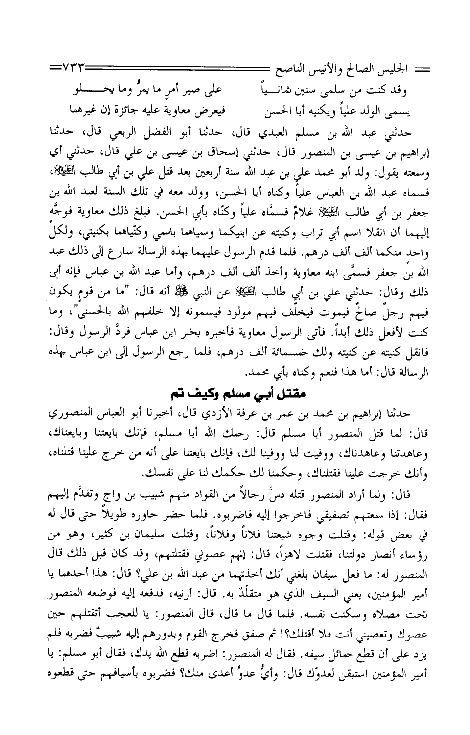 حَدَّثَنِي عَبْدُ اللَّهِ بْنُ مُسْلِمٍ الْعَبْدِيُّ قَالَ، حَدَّثَنَا أَبُو الْفَضْلِ الربعِي قَالَ، حَدَّثَنَا إِبْرَاهِيم بْن عِيسَى بْنِ الْمَنْصُورِ قَالَ، حَدَّثَنِي إِسْحَاقُ بْنُ عِيسَى بْنِ عَلِيٍّ قَالَ، حَدثنِي أَي وَسَمِعْتُهُ يَقُولُ: وُلِدَ أَبُو مُحَمَّدٍ عَلِيُّ بْنُ عَبْدِ اللَّهِ سَنَةَ أَرْبَعِينَ بَعْدَ قَتْلِ عَلِيِّ بْنِ أَبِي طَالِبٍ عَلَيْهِ السَّلامُ، فَسَمَّاهُ عَبْدُ اللَّهِ بْنُ الْعَبَّاسِ عَلِيًّا وكناه أبي الْحَسَنِ، وَوُلِدَ مَعَهُ فِي تِلْكَ السَّنَةِ لِعَبْدِ اللَّهِ بْنِ جَعْفَرِ بْن أبي طَالِب عَلَيْهِ السّلام غلامٌ فسمَّاه عَلِيًّا وَكَنَّاهُ بِأَبِي الْحَسَنِ. فَبَلَغَ ذَلِكَ مُعَاوِيَةَ فوجَّه إِلَيْهِمَا أَنِ انْقُلا اسْمَ أَبِي تُرَابٍ وَكُنْيَتَهُ عَنِ ابْنَيْكُمَا وَسَمِّيَاهُمَا بِاسْمِي وَكَنِّيَاهُمَا بِكُنْيَتِي، ولكلِّ واحدٍ مِنْكُمَا أَلْفُ أَلْفِ دِرْهَمٍ. فَلَمَّا قَدِمَ الرَّسُولُ عَلَيْهِمَا بِهَذِهِ الرِّسَالَةِ سَارَعَ إِلَى ذَلِكَ عَبْدُ اللَّهِ بْنُ جَعْفَرٍ فسمَّى ابْنَهُ مُعَاوِيَةَ وَأَخَذَ أَلْفَ أَلْفِ دِرْهَمٍ، وَأَمَّا عَبْدُ اللَّهِ بْنُ عَبَّاسٍ فَإِنَّهُ أَبَى ذَلِكَ وَقَالَ: حَدَّثَنِي عَلِيُّ بْن أبي طَالِب عَلَيْهِ السّلام عَنِ النَّبيّ صَلَّى اللَّهُ عَلَيْهِ وَسَلَّمَ أَنَّهُ قَالَ: " مَا من قومٍ يَكُونُ فِيهِمْ رجلٌ صالحٌ فَيَمُوت فيخلّف فيهم مَوْلُود فيسمونه إِلا خَلَّفَهُمُ اللَّهُ بِالْحُسْنَى "، وَمَا كُنْتُ لأَفْعَلَ ذَلِكَ أَبَدًا. فَأَتَى الرَّسُولُ مُعَاوِيَةَ فَأَخْبَرَهُ بِخَبَرِ ابْنِ عَبَّاسٍ فردَّ الرَّسُولَ وَقَالَ: فَانْقُلْ كنيته عَن كنيته وَلَك خَمْسمِائَة أَلْفِ دِرْهَمٍ، فَلَمَّا رَجَعَ الرَّسُولُ إِلَى ابْنِ عَبَّاسٍ بِهَذِهِ الرِّسَالَةِ قَالَ: أَمَّا هَذَا فَنَعَمْ وَكَنَّاهُ بِأَبِي مُحَمَّدٍ.
