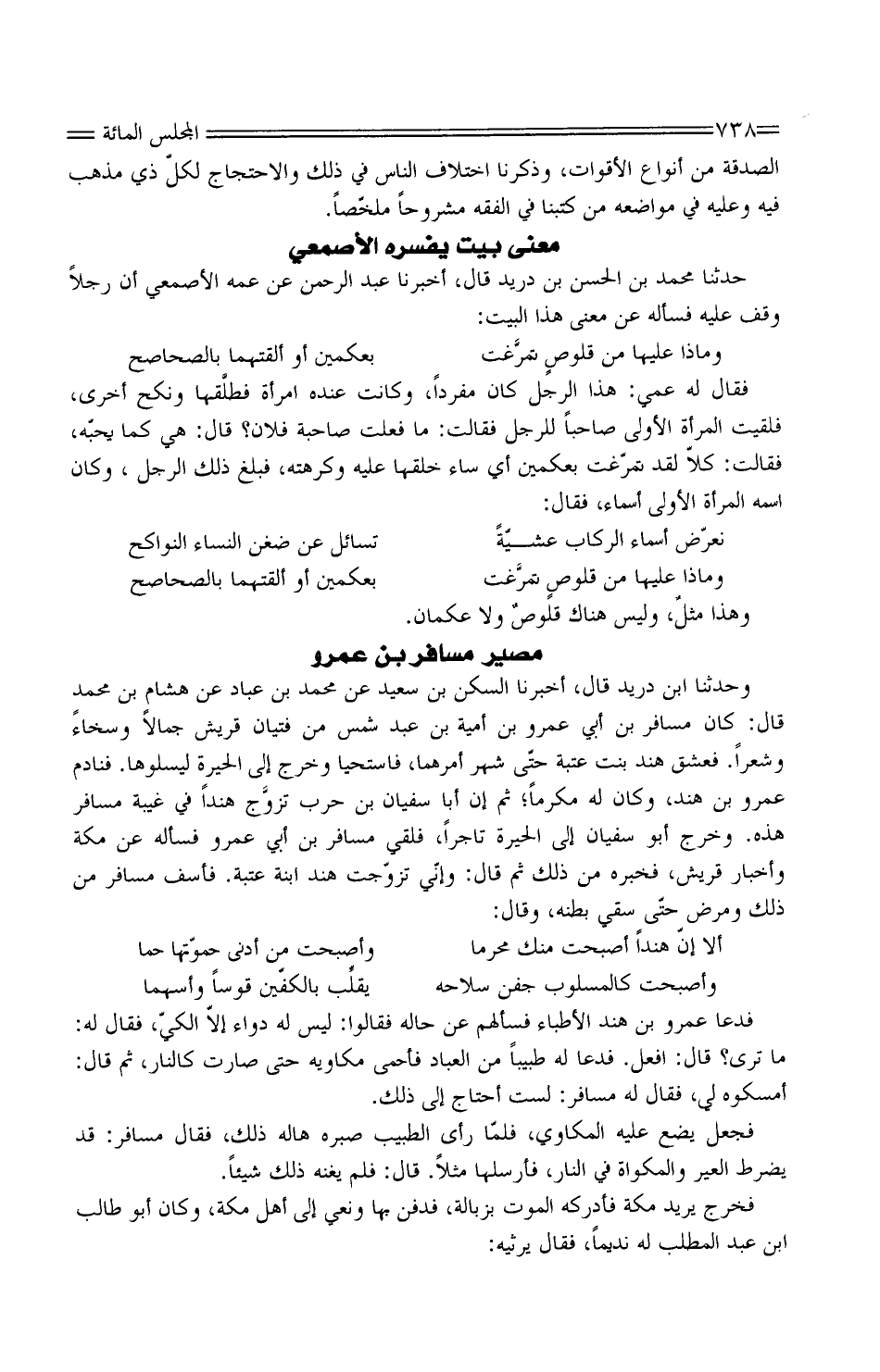 حَدَّثَنَا مُحَمَّد بن الْحَسَن بْن دُرَيْد قَالَ، أَخْبَرَنَا عَبْد الرَّحْمَن عَنْ عَمه الْأَصْمَعِي أَن رجلا وقفَ عَلَيْهِ فَسَأَلَهُ عَن معنى هَذَا الْبَيْت:
