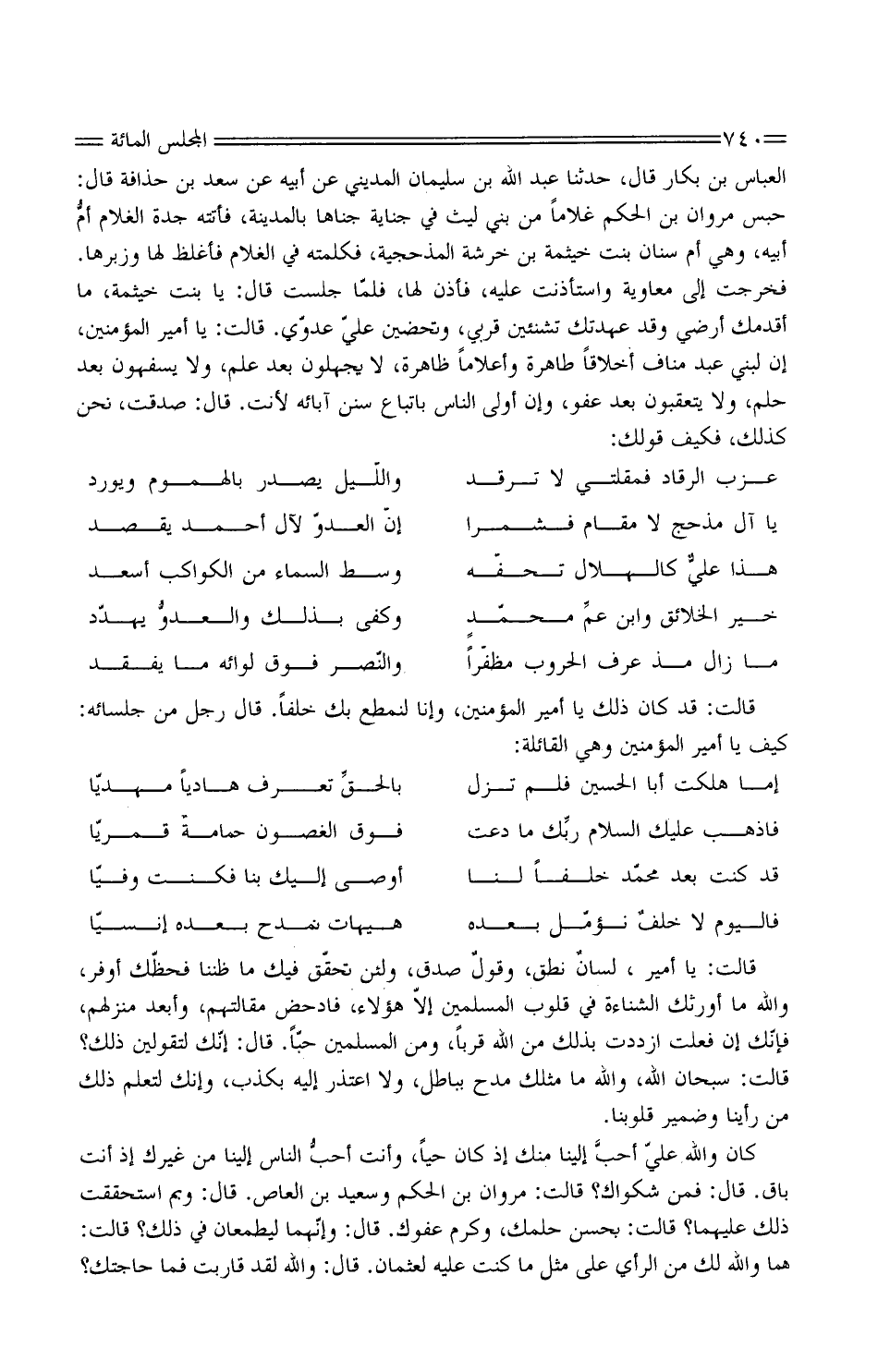 الْعَبَّاس بْن بكار قَالَ، حَدَّثَنَا عَبْدُ اللَّهِ بْنُ سُلَيْمَانَ الْمَدِينِيُّ عَنْ أَبِيهِ عَنْ سَعْدِ بْنِ حُذَافَةَ قَالَ: حَبَسَ مَرْوَانُ بْنُ الْحَكَمِ غُلامًا مِنْ بَنِي لَيْثٍ فِي جِنَايَةٍ جَنَاهَا بِالْمَدِينَةِ، فَأَتَتْهُ جَدَّةُ الْغُلامِ أمُّ أَبِيهِ، وَهِيَ أُمُّ سِنَانٍ بِنْتُ خَيْثَمَةَ بْنِ خَرَشَةَ الْمَذْحِجِيَّةُ، فَكَلَّمَتْهُ فِي الْغُلامِ فَأَغْلَظَ لَهَا وَزَبَرَهَا. فَخَرَجَتْ إِلَى مُعَاوِيَةَ وَاسْتَأْذَنَتْ عَلَيْهِ، فَأَذِنَ لَهَا، فَلَمَّا جَلَسَتْ قَالَ: يَا بِنْتَ خَيْثَمَةَ، مَا أَقْدَمَكِ أَرْضِي وَقَدْ عَهِدْتُكِ تَشْنَأِينَ قُرْبِي، وَتَحُضِّينَ عَلَيَّ عَدُوِّي. قَالَتْ: يَا أَمِيرَ الْمُؤْمِنِينَ، إِنَّ لِبَنِي عَبْدِ مَنَافٍ أَخْلاقًا طَاهِرَةً وَأَعْلامًا ظَاهِرَةً، لَا يَجْهَلُونَ بَعْدَ عِلْمٍ، وَلا يَسْفَهُونَ بَعْدَ حِلْمٍ، وَلا يَتَعَقَّبُونَ بَعْدَ عَفْوٍ، وَإِنَّ أَوْلَى النَّاسِ بِاتِّبَاعِ سُنَنِ آبَائِهِ لأَنْتَ. قَالَ: صَدَقْتِ، نَحْنُ كَذَلِكِ، فَكَيْفَ قَوْلُكِ:
