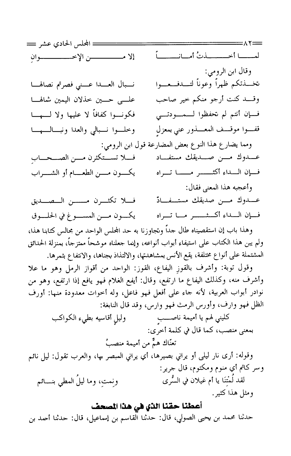وَهَذَا بَاب إِن استقصيناه طَال جدا وتجاوزنا بِهِ حدّ الْمجْلس الْوَاحِد من مجَالِس كتَابنَا هَذَا، وَلم يبن هَذَا الْكتاب عَلَى اسْتِيفَاء أَبْوَاب أَنْوَاعه، وَإِنَّمَا جَعَلْنَاهُ موشحا ممتزجًا، بِمَنْزِلَة الحدائق الْمُشْتَملَة عَلَى أَنْوَاع مُخْتَلفَة، يَقع الْأنس بمشاهدتها، والالتذاذ بجناها، وَالِانْتِفَاع بثمرها.