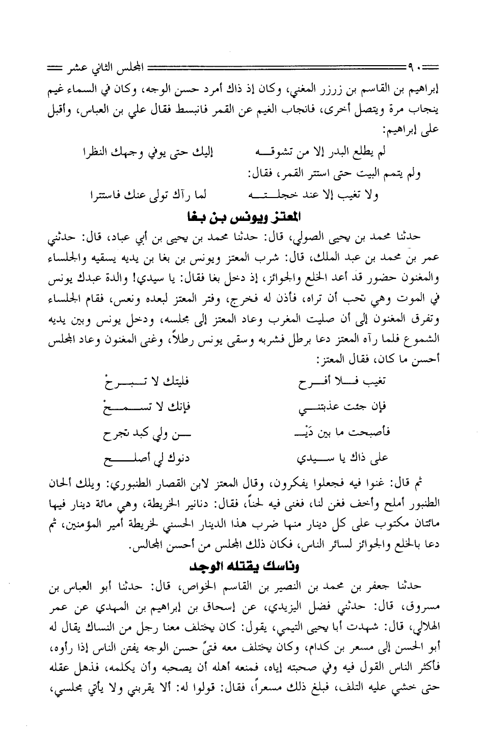 حَدَّثَنَا مُحَمَّد بْن يحيى الصولي، قَالَ: حَدَّثَنَا مُحَمَّد بْن يحيى بْن أَبِي عَبّاد، قَالَ: حَدَّثَنِي عُمَر بْن مُحَمَّد بْن عَبْد الْملك، قَالَ: شرب المعتز وَيُونُس بْن بغا بن يَدَيْهِ يسْقِيه والجلساء والمغنون حُضور قَدْ أعدَّ الْخِلَع والجوائز، إِذْ دَخَلَ بُغا فَقَالَ: يَا سَيِّدي! وَالِدَة عَبدك يُونُس فِي الْمَوْت وَهِي تحب أَن ترَاهُ، فَأذن لَهُ فَخرج، وفَتَر المعتز لبُعْده ونَعِس، فَقَامَ الْجُلساءُ وتفرَّق المغنون إِلَى أَن صليت الْمغرب وَعَاد المعتز إِلَى مَجْلِسه، وَدخل يُونُس وَبَين يَدَيْهِ الشموع فَلَمَّا رَآهُ المعتز دَعَا برطل فشربه وَسَقَى يُونُس رطلا، وغنى المغنون وَعَاد الْمجْلس أحسن مَا كَانَ، فَقَالَ المعتز: