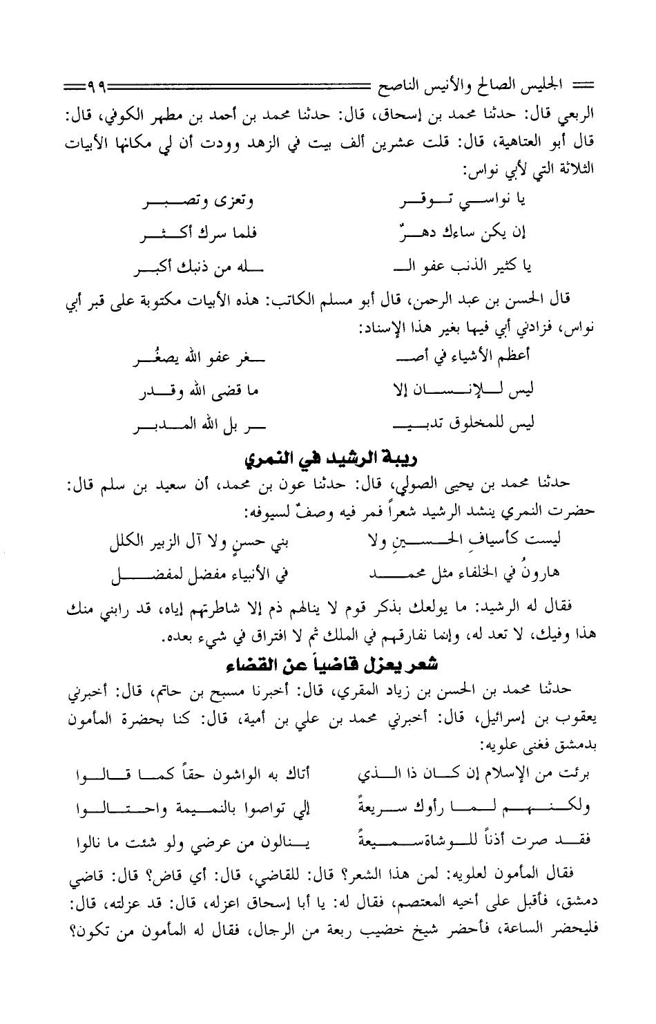 الرَّبَعيّ قَالَ: حَدَّثَنَا مُحَمَّد بْن إِسْحَاق، قَالَ: حَدَّثَنَا مُحَمَّد بْن أَحْمَد بْن مطهر الْكُوفِي، قَالَ: قَالَ أَبُو الْعَتَاهِيَة، قَالَ: قلت عشْرين ألف بَيت فِي الزّهْد وودت أنَّ لي مَكَانهَا الأبيات الثَّلَاثَة الَّتِي لأبي نواس: