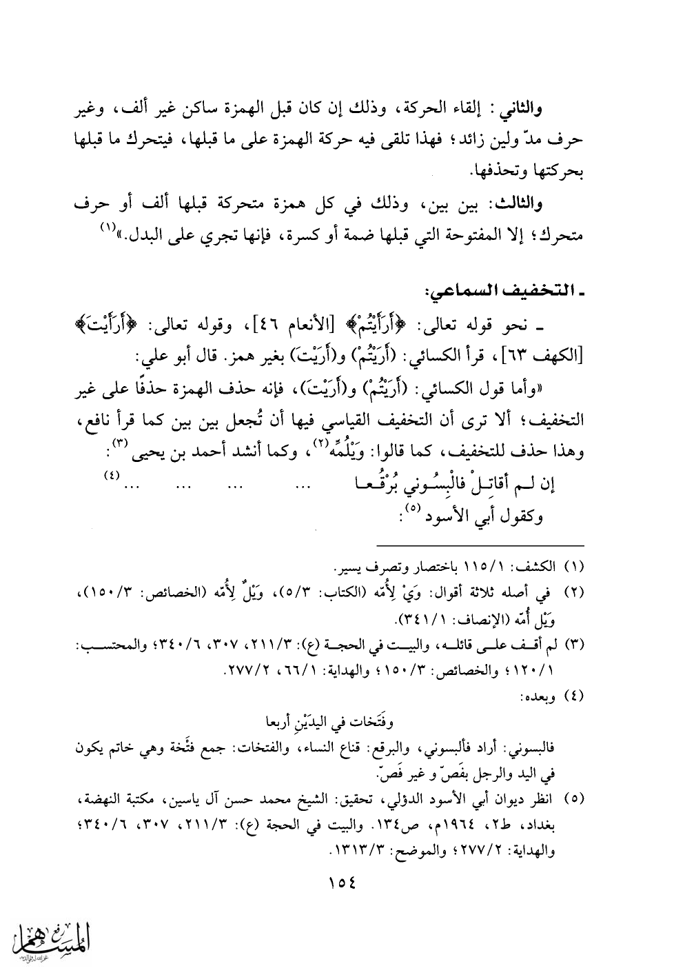 «وأما قول الكسائي: (أريتم) و (أريت)، فإنه حذف الهمزة حذفا على غير التخفيف؛ ألا ترى أن التخفيف القياسي فيها أن تجعل بين بين كما قرأ نافع، وهذا حذف للتخفيف، كما قالوا: ويلمّه «2»، وكما أنشد أحمد بن يحيى «3»: