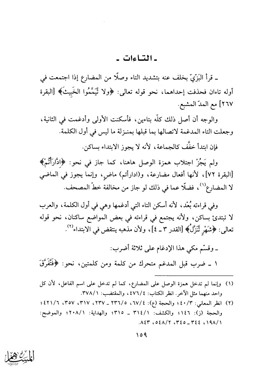 (2) انظر المعاني: 3/ 40؛ والحجة (ع): 4/ 67، 5/ 236 - 237، 317، 357، 6/ 421؛ والحجة (ز): 146؛ والكشف: 1/ 314 - 315؛ والهداية: 1/ 208؛ والموضح: