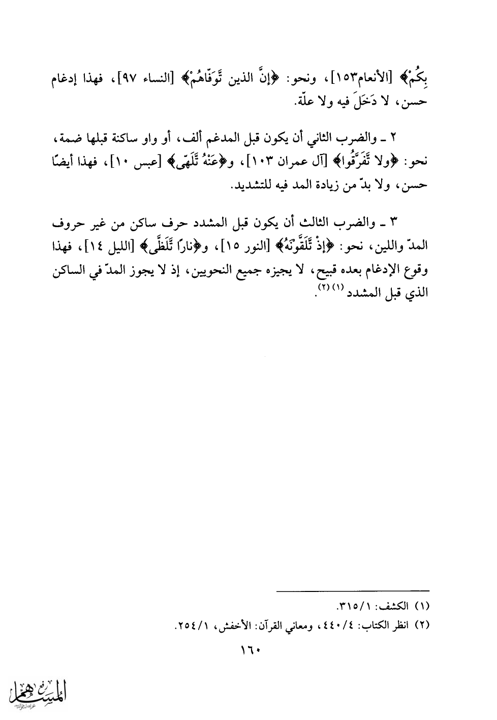 2 - والضرب الثاني أن يكون قبل المدغم ألف، أو واو ساكنة قبلها ضمة، نحو: وَلا تَفَرَّقُوا [آل عمران 103]، وعَنْهُ تَلَهَّى [عبس 10]، فهذا أيضا حسن، ولا بدّ من زيادة المد فيه للتشديد.