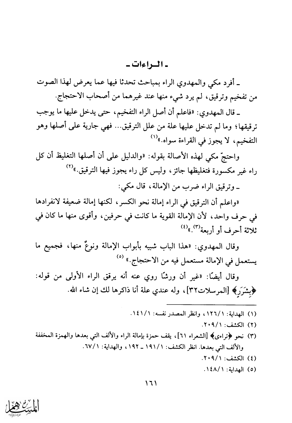 - أفرد مكي والمهدوي الراء بمباحث تحدثا فيها عما يعرض لهذا الصوت من تفخيم وترقيق، لم يرد شيء منها عند غيرهما من أصحاب الاحتجاج.
