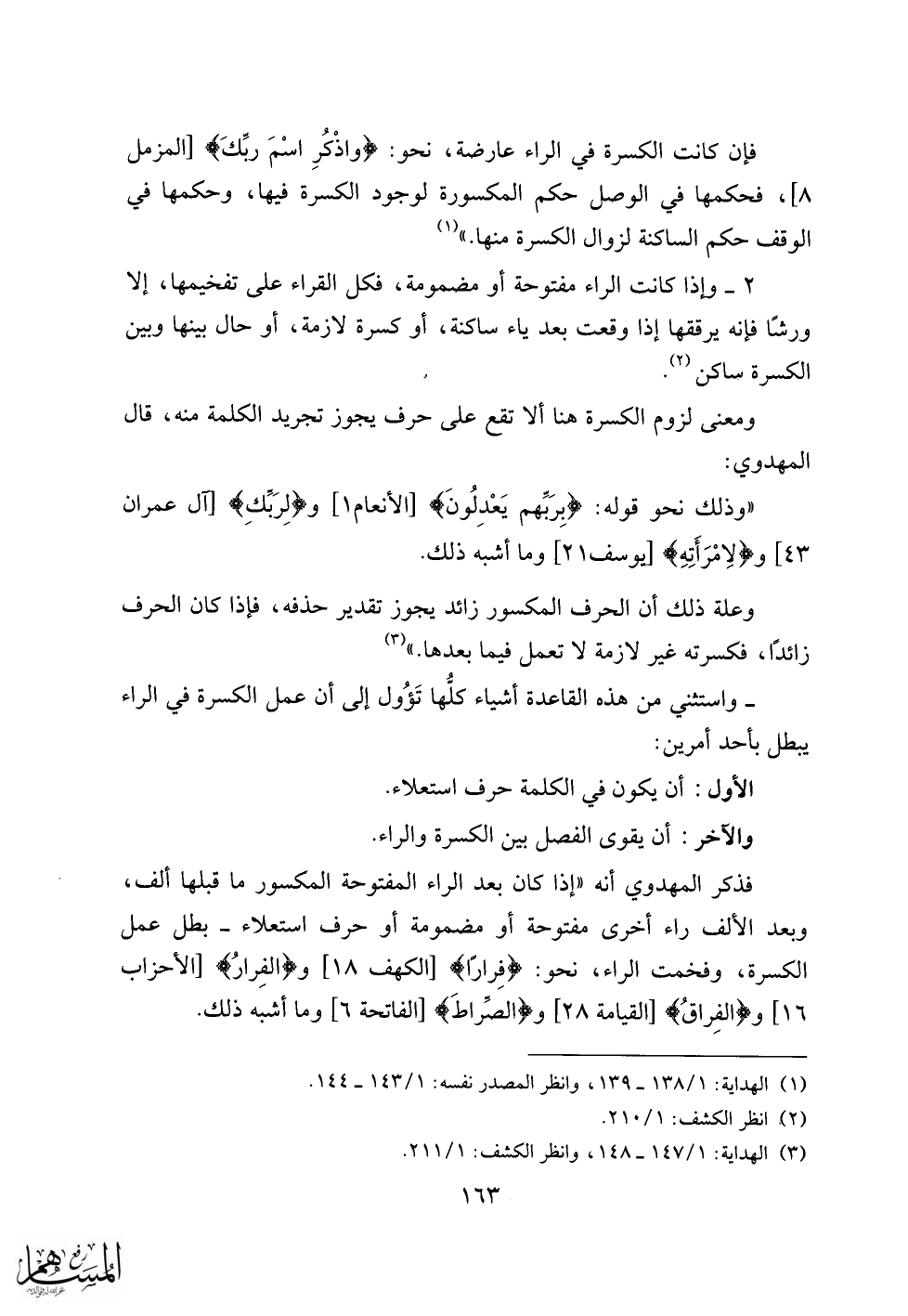 فذكر المهدوي أنه «إذا كان بعد الراء المفتوحة المكسور ما قبلها ألف، وبعد الألف راء أخرى مفتوحة أو مضمومة أو حرف استعلاء- بطل عمل الكسرة، وفخمت الراء، نحو: فِراراً [الكهف 18] والْفِرارُ [الأحزاب 16] والْفِراقُ [القيامة 28] والصِّراطَ [الفاتحة 6] وما أشبه ذلك.