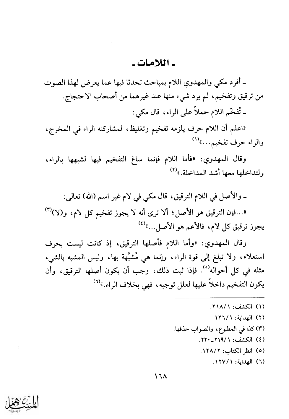 - أفرد مكي والمهدوي اللام بمباحث تحدثا فيها عما يعرض لهذا الصوت من ترقيق وتفخيم، لم يرد شيء منها عند غيرهما من أصحاب الاحتجاج.