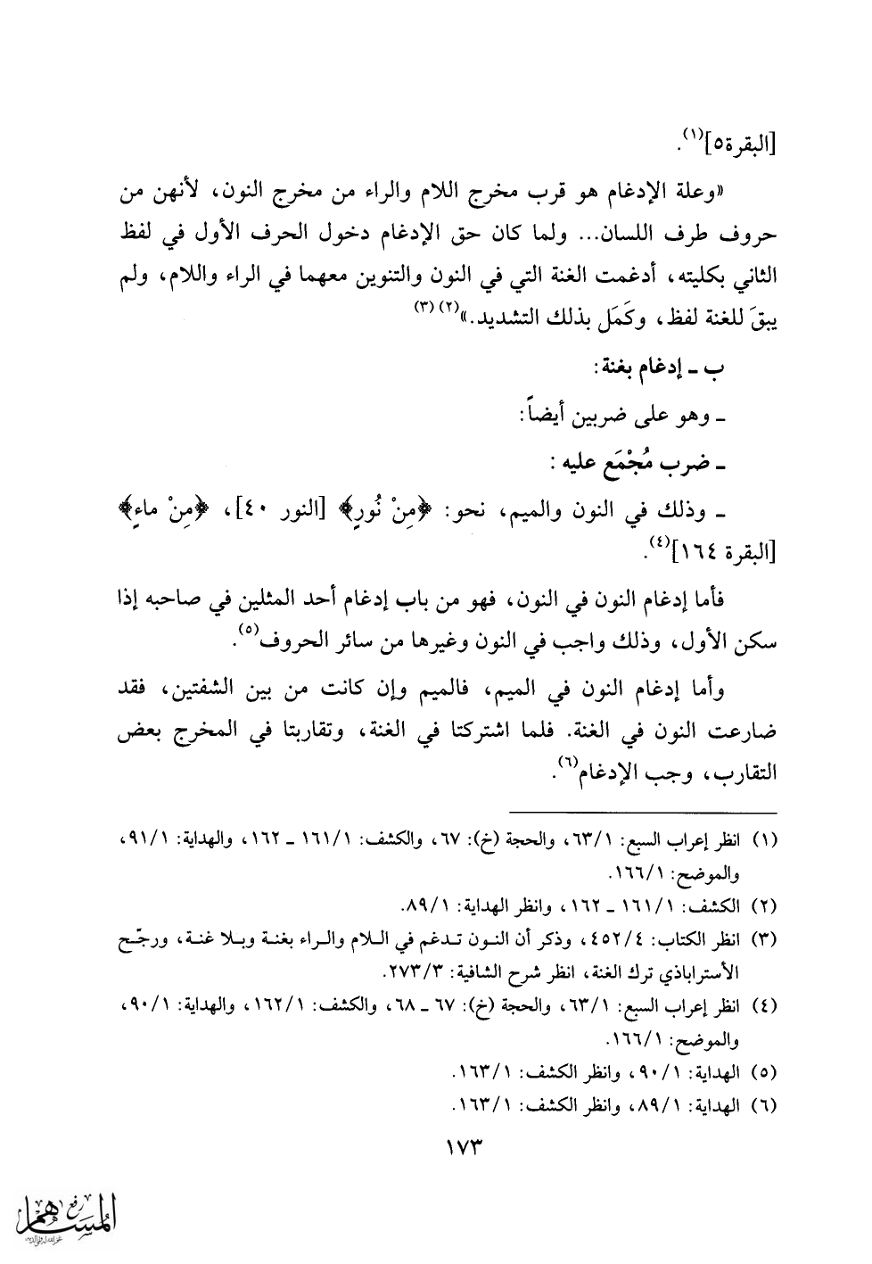 (3) انظر الكتاب: 4/ 452، وذكر أن النون تدغم في اللام والراء بغنة وبلا غنة، ورجّح الأسترآباذي ترك الغنة، انظر شرح الشافية: 3/ 273.